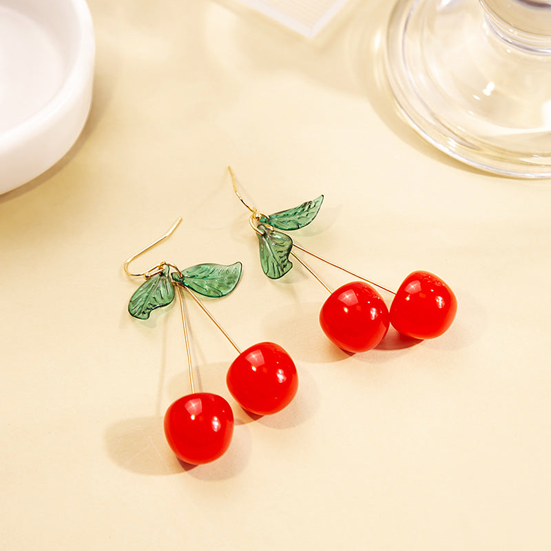 Estos aretes de cerezas colgantes son el toque dulce y coqueto que transforma cualquier outfit. Su diseño inspirado en frutas, con cerezas rojas brillantes y delicadas hojas verdes, crea un look divertido pero femenino, ideal para elevar desde un outfit casual hasta un look más especial. El acabado brillante y los detalles en dorado aportan un aire fresco, juvenil y lleno de personalidad.
