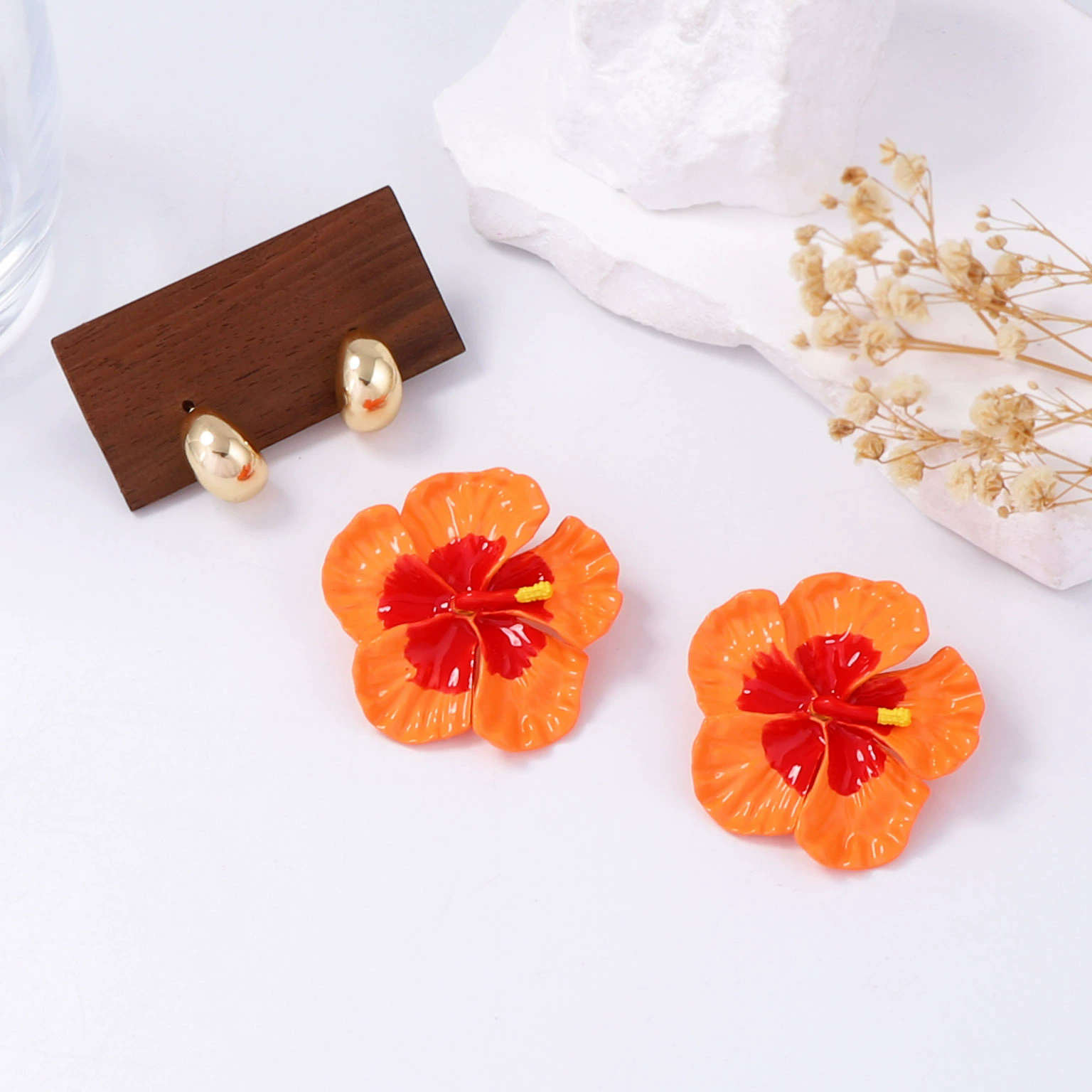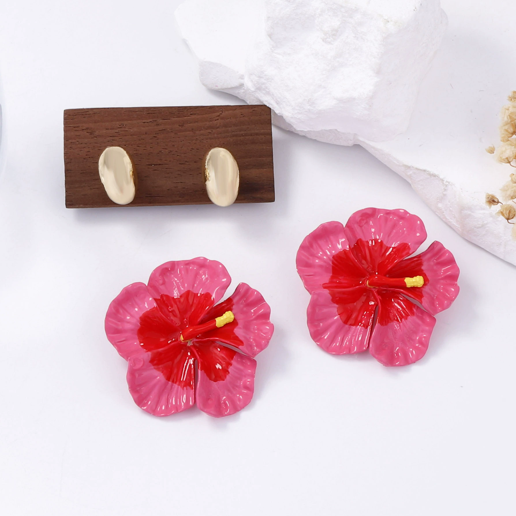 Estos aretes en forma de flor tropical son el accesorio perfecto para darle vida y personalidad a cualquier look. Su diseño floral tipo hibiscus, con acabado brillante y colores vibrantes, aporta un toque alegre, femenino y llamativo que no pasa desapercibido. Ideales para looks de verano, vacaciones, eventos al aire libre o para elevar outfits básicos con un detalle protagonista.