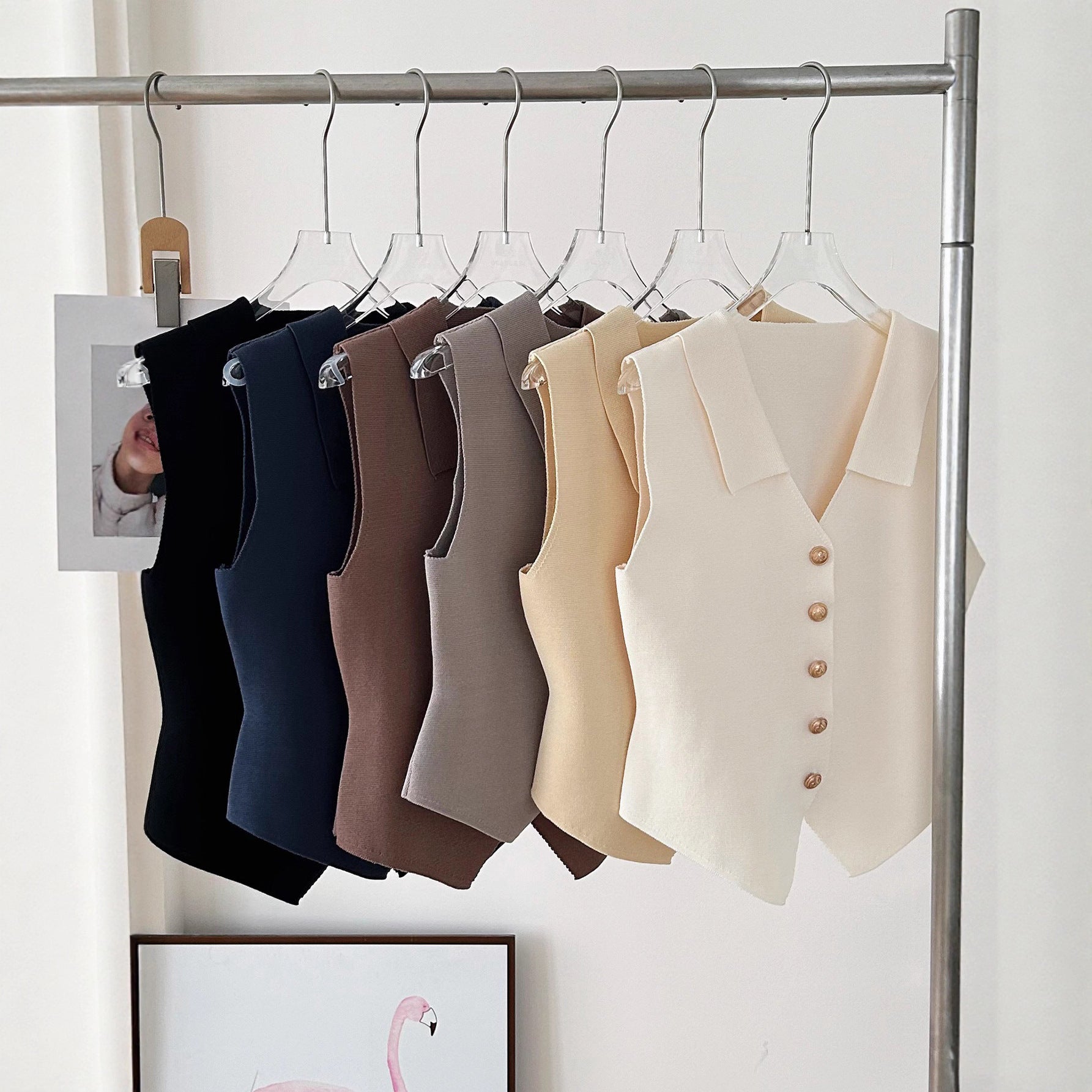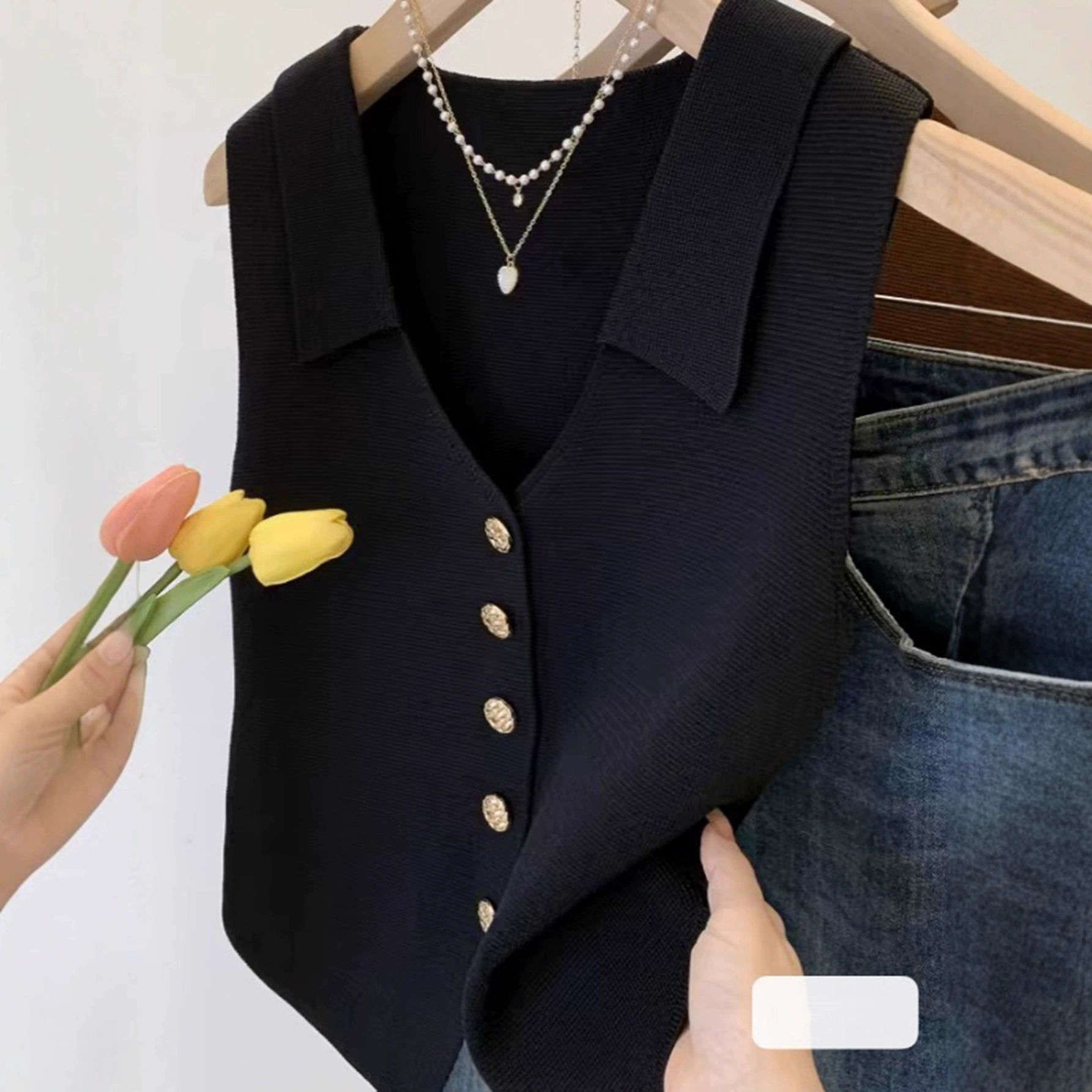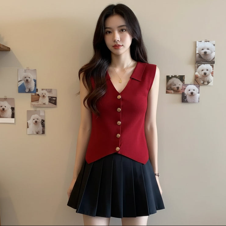 Esta blusa sin mangas con cuello y botones dorados al frente resalta por su silueta elegante y su detalle de bajo en punta. Perfecta para combinar con faldas o pantalones, creando looks versátiles que van del casual chic al sofisticado.