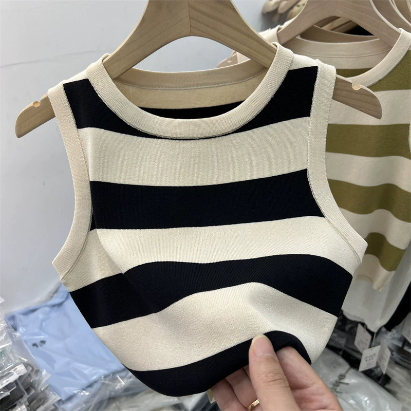 Top sin mangas de punto con diseño de rayas. Su estilo casual y versátil lo convierte en una pieza esencial para el día a día, fácil de combinar con jeans o faldas para un look moderno y relajado.