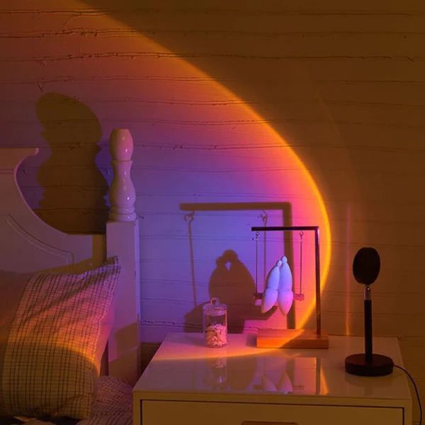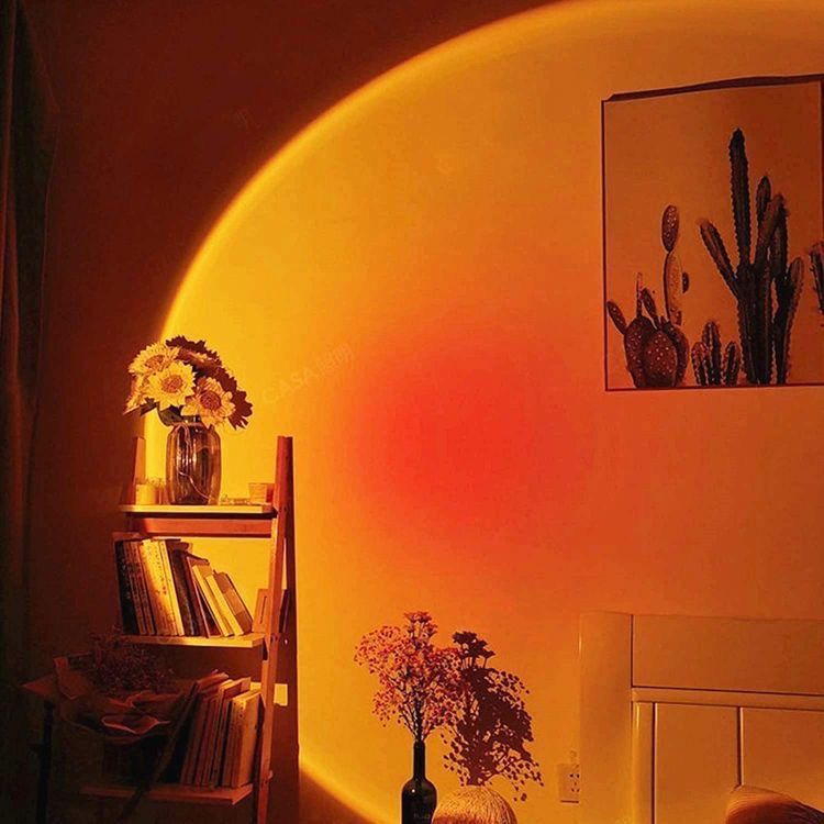 La lámpara proyectora LED sunset proyecta un efecto tipo atardecer que llena cualquier habitación con un ambiente cálido, relajante y moderno.