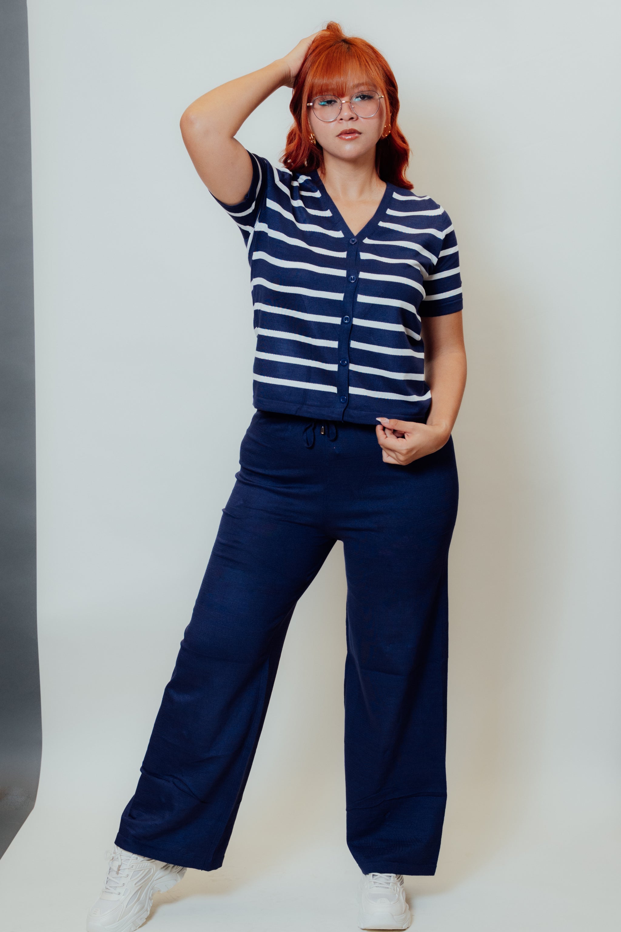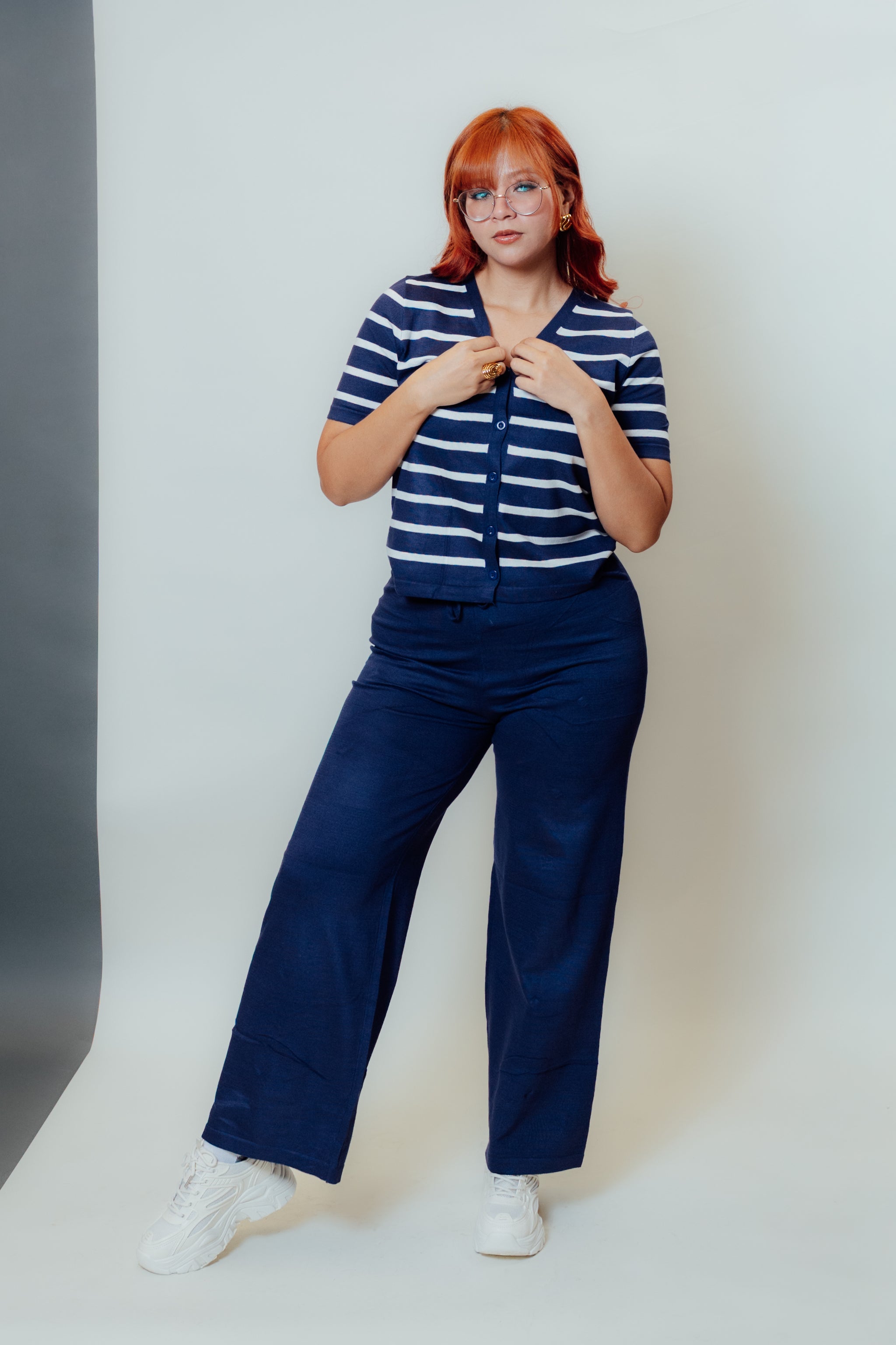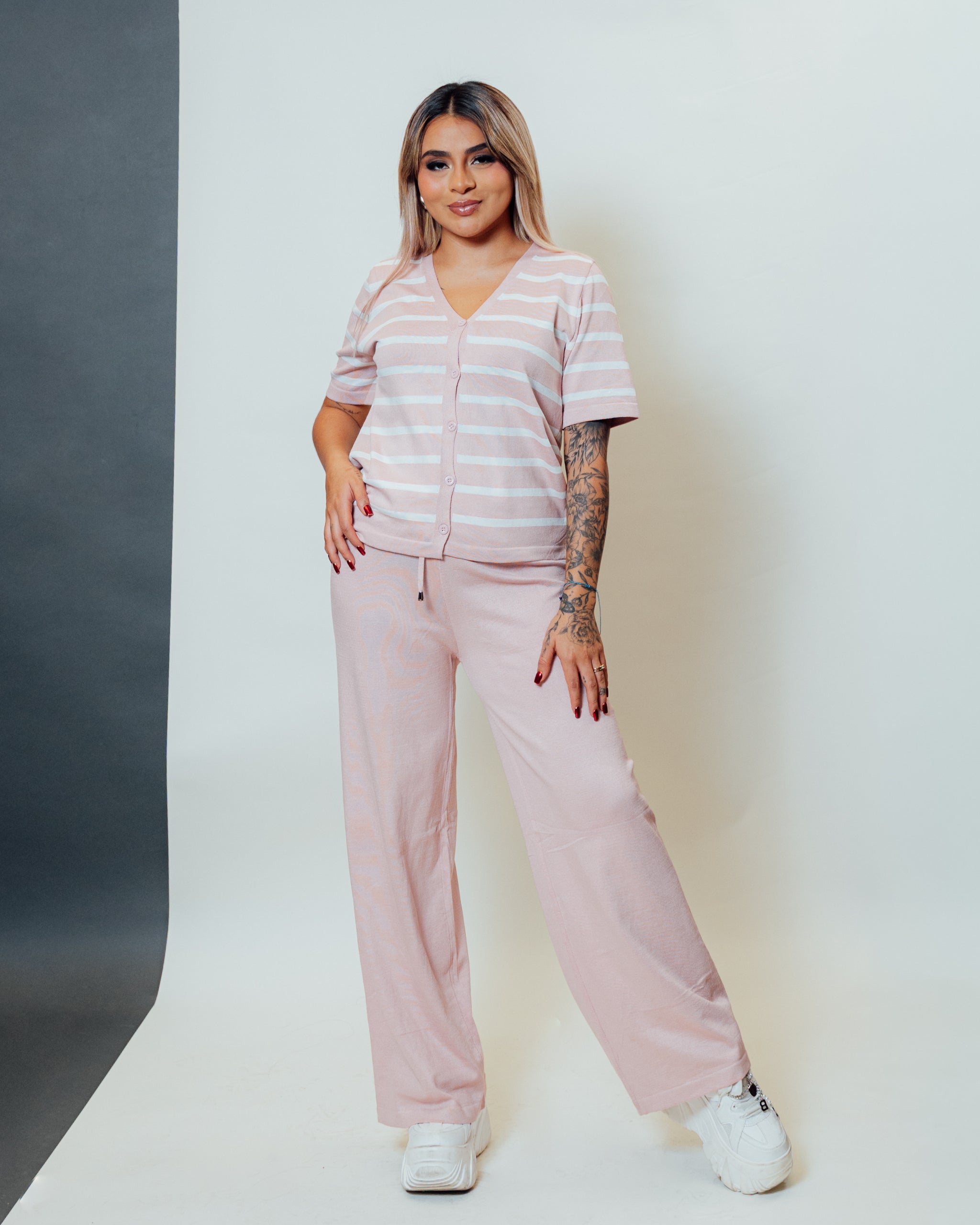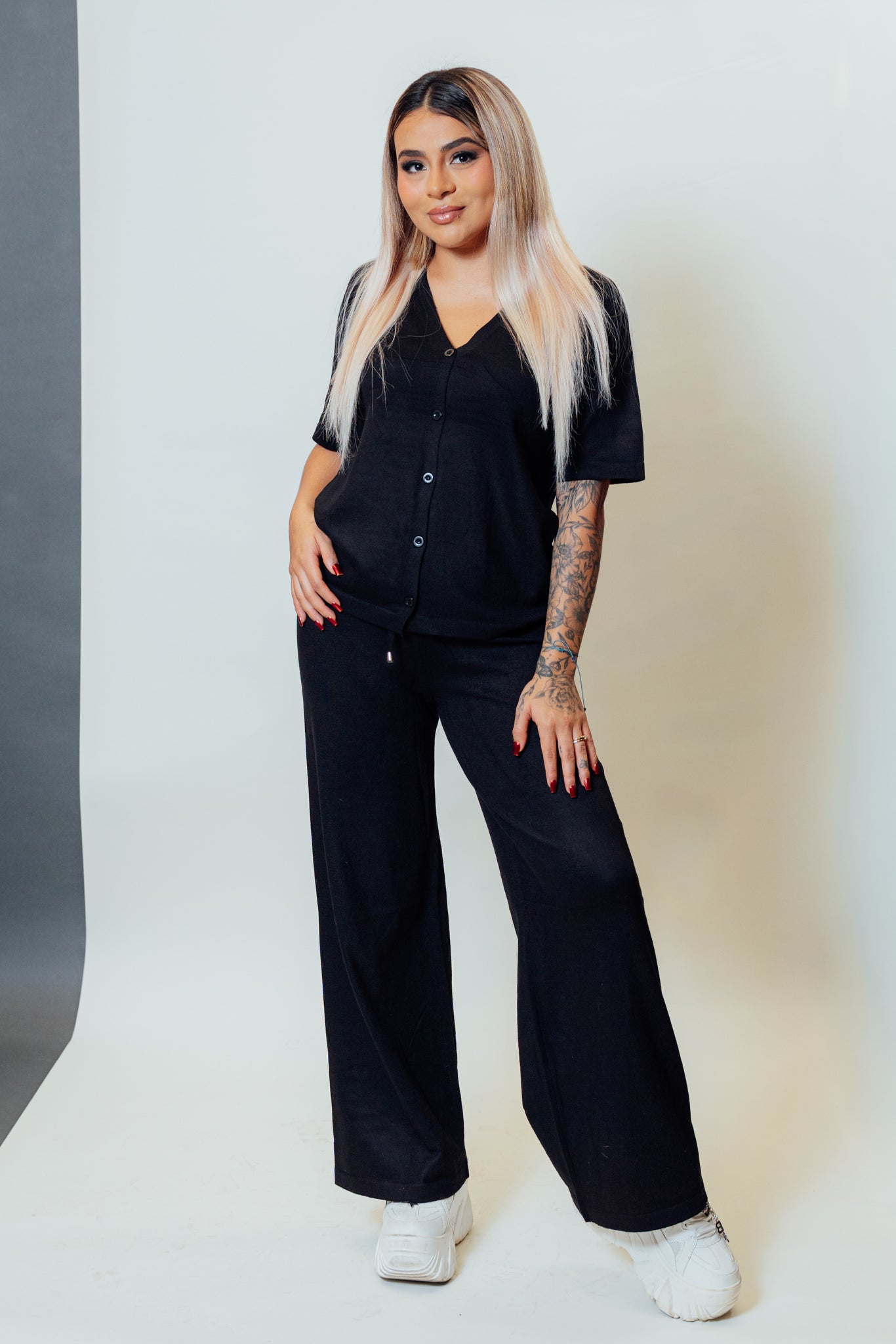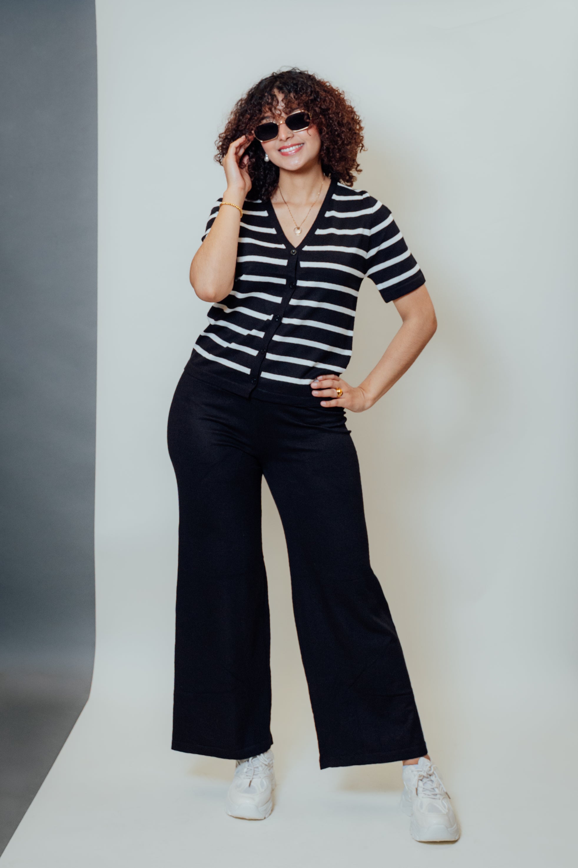 Conjunto de dos piezas tejido con estilo moderno y versátil para mujer, diseñado para combinar comodidad y moda en un solo look. Incluye top de manga corta con corte recto y pantalón tipo palazzo, ideal para dar un toque moderno a tu outfit.