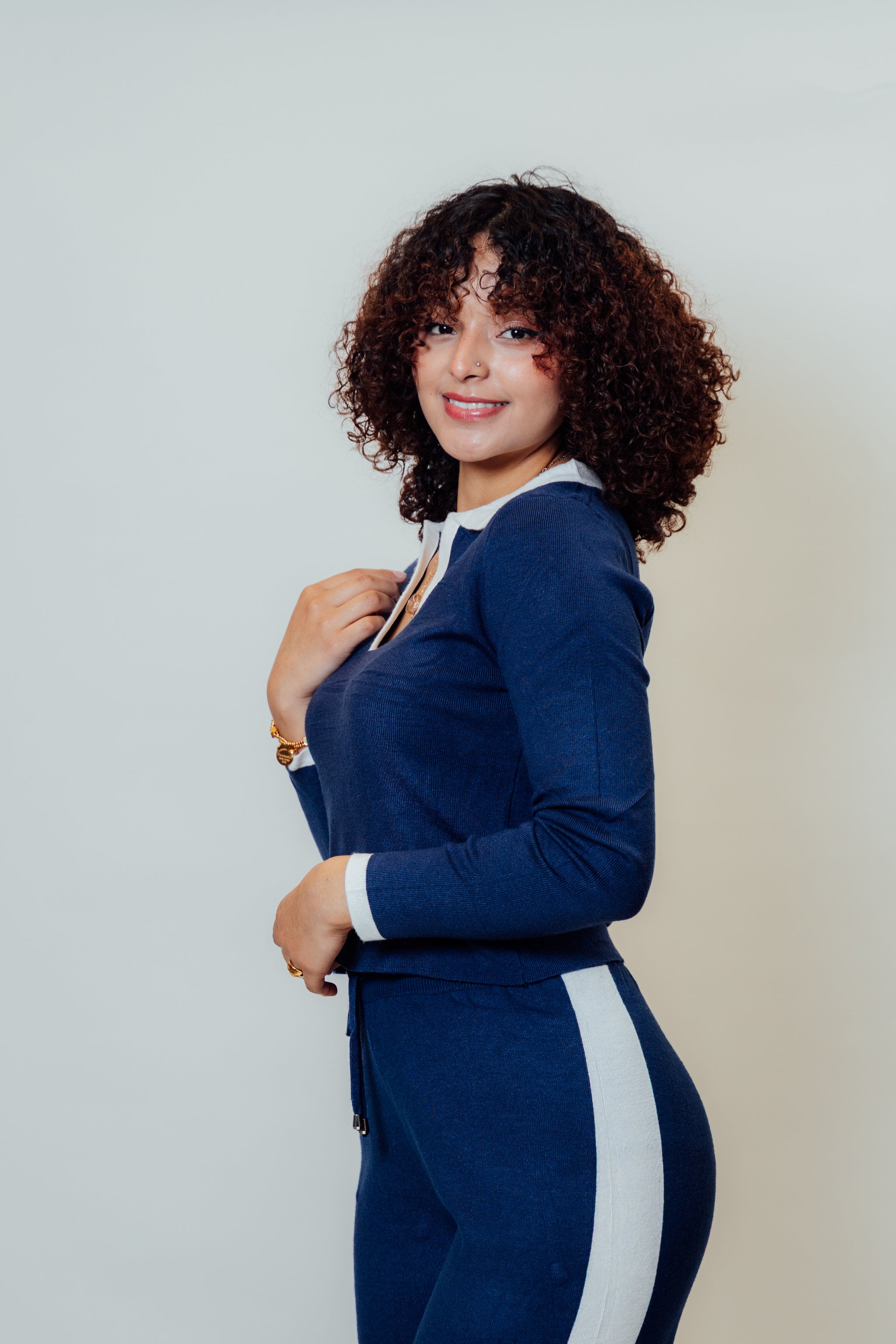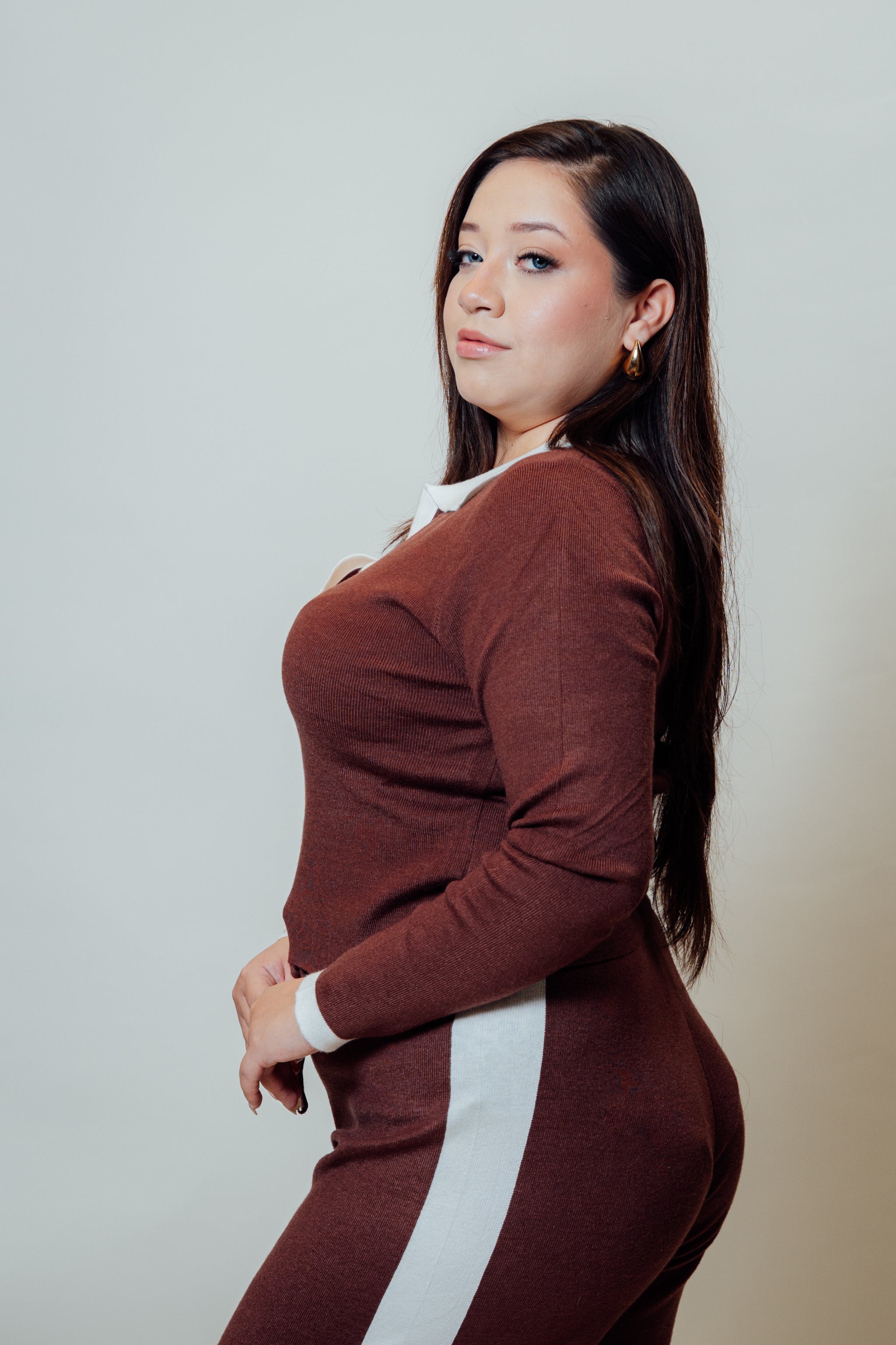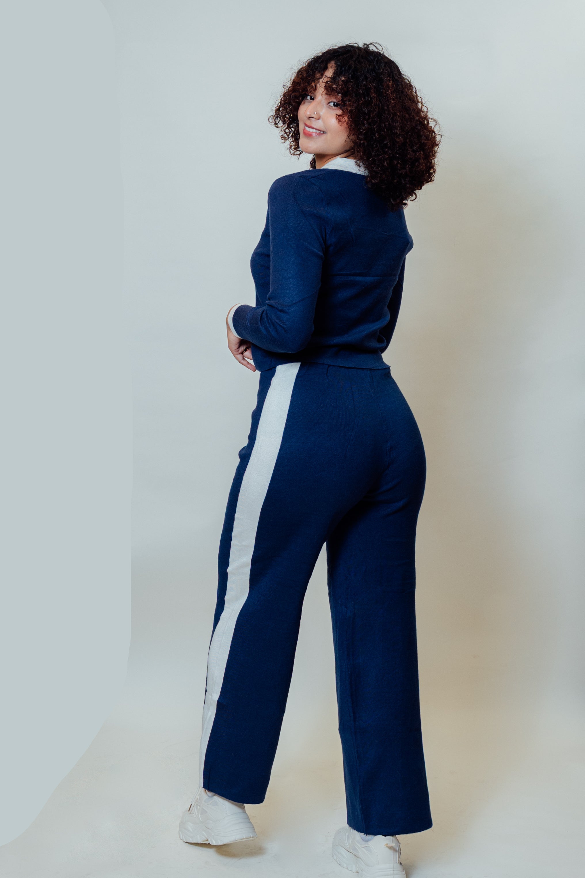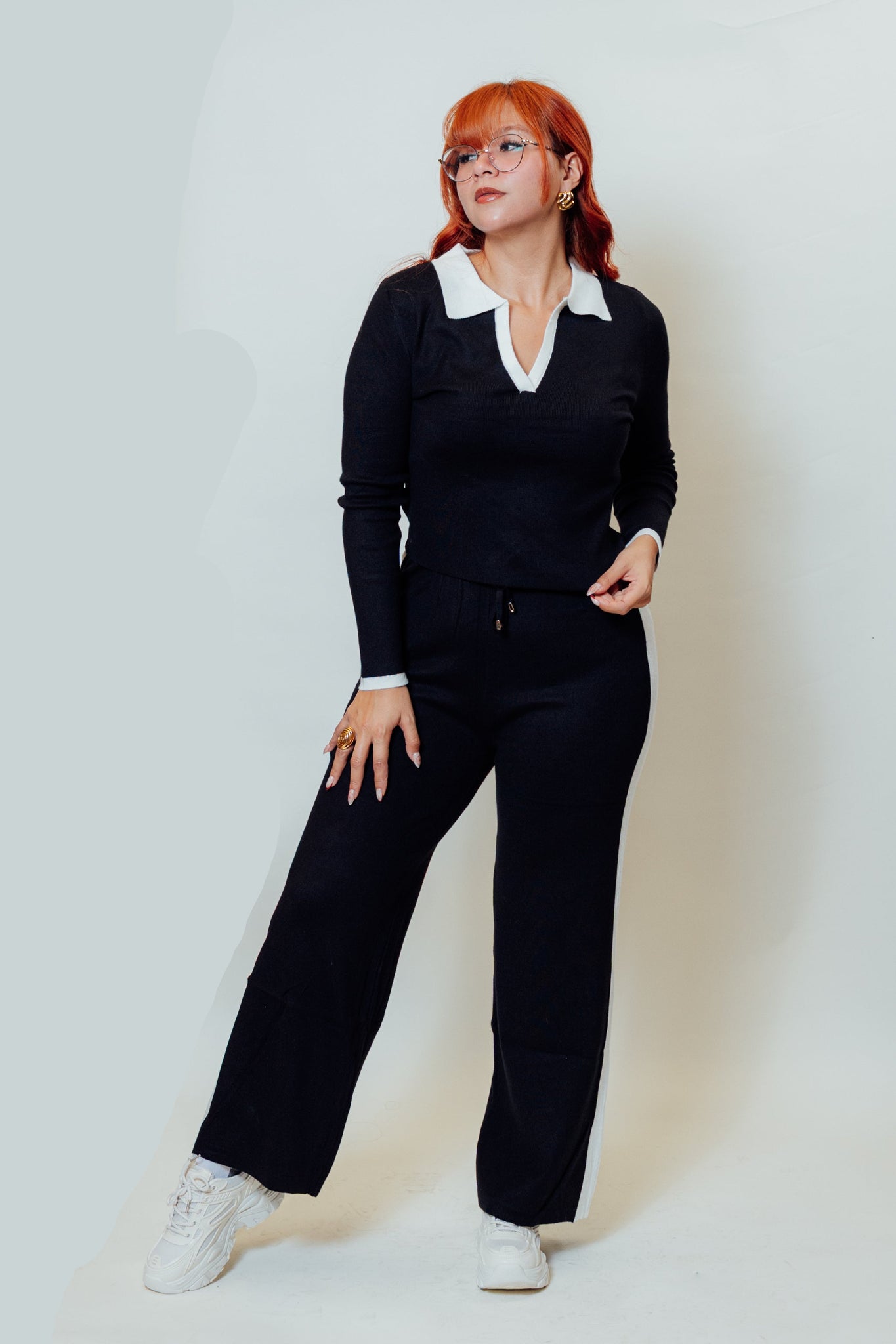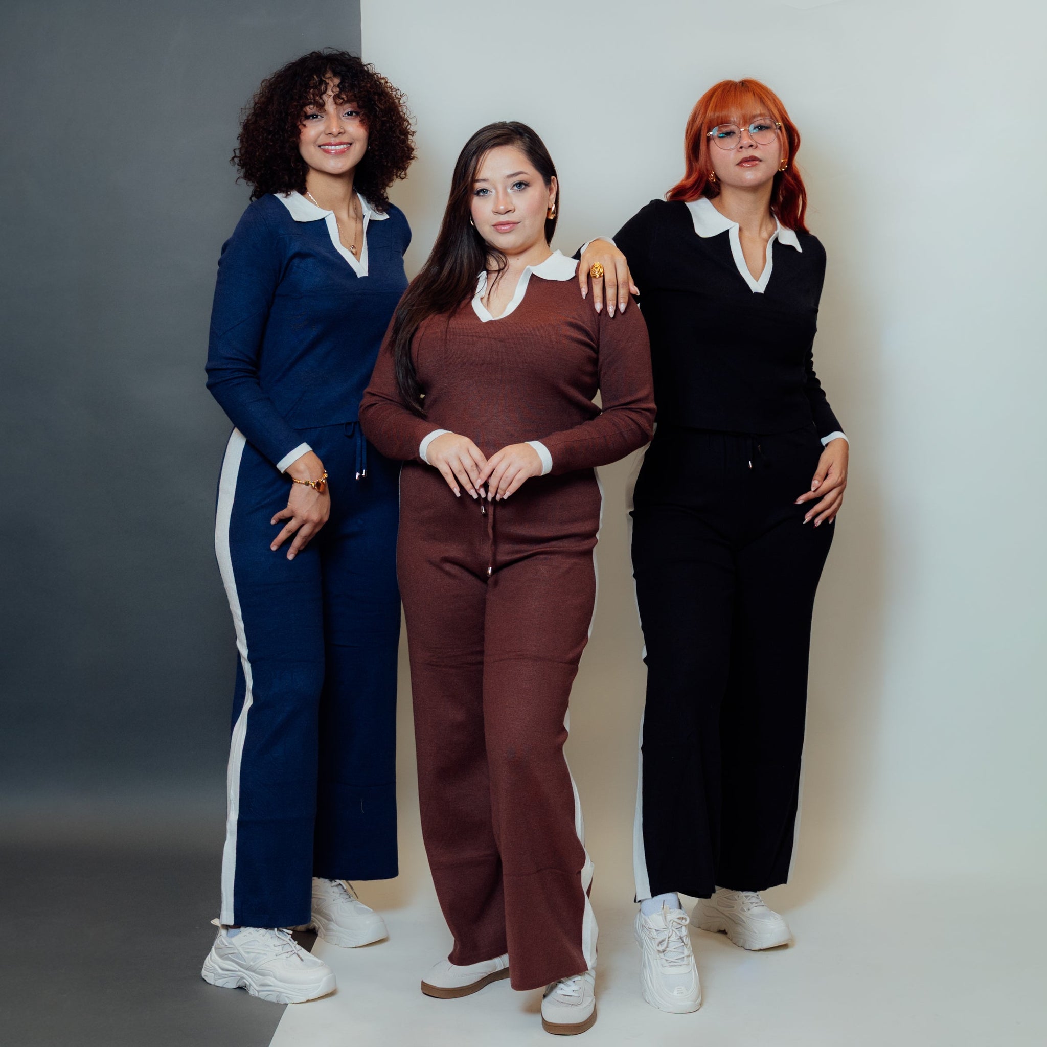 Conjunto de dos piezas tejido con estilo moderno y versátil. Ideal para crear looks casuales con un toque chic, manteniendo la comodidad durante todo el día. Perfecta para cualquier temporada. blusa de cuello y manga larga