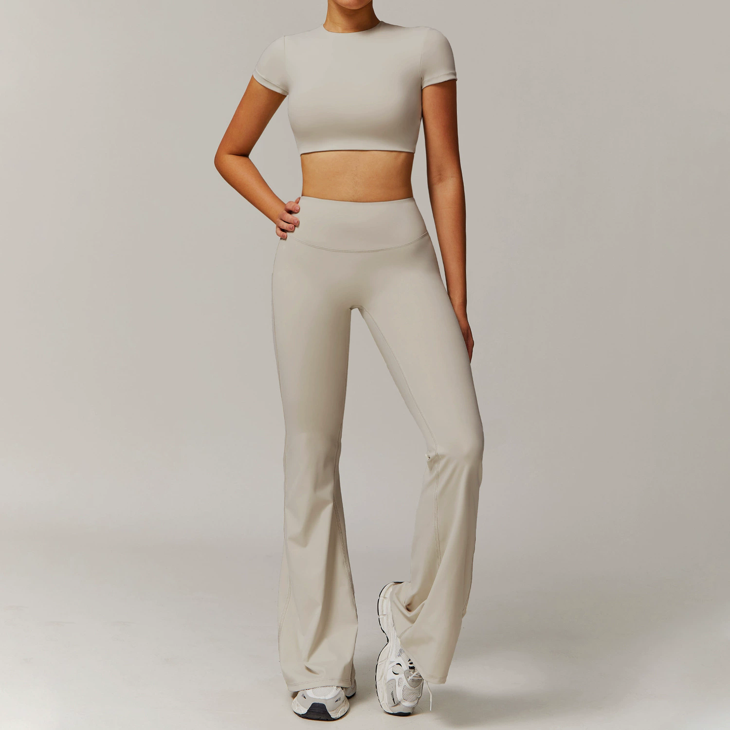Este set deportivo flare es la mezcla perfecta entre comodidad, estilo y silueta favorecedora. El crop top de manga corta ofrece un ajuste limpio y moderno, mientras que su espalda abierta añade un toque femenino y actual que eleva cualquier look deportivo. Es ideal para entrenar, salir o llevarlo todo el día sin sacrificar comodidad
