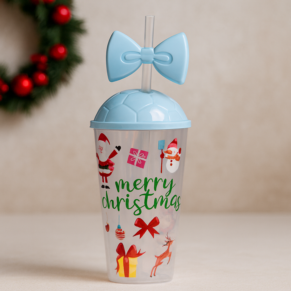 Celebra la magia de la Navidad con este vaso navideño reutilizable con popote y tapa de moño. Perfecto para acompañar tus bebidas favoritas en estas fiestas, su diseño transparente está decorado con motivos navideños como Santa, renos, regalos y arbolitos de Navidad.