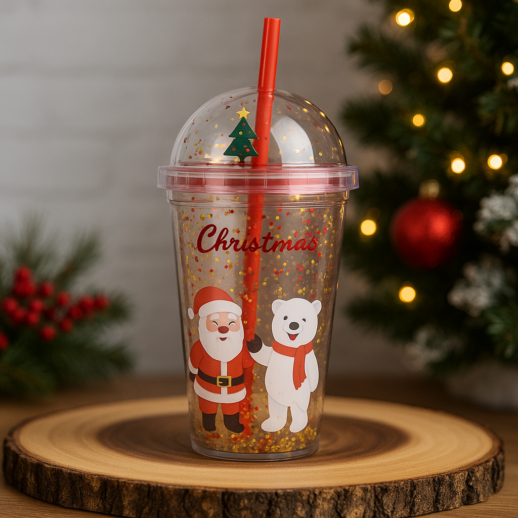 Disfruta de tus bebidas favoritas con el toque más festivo gracias a este vaso navideño con tapa tipo globo de nieve. Su diseño incluye figuritas 3D (Santa Claus o Árbol de Navidad) rodeadas de escarcha dorada que se mueve al agitarlo, creando un efecto mágico y divertido.
