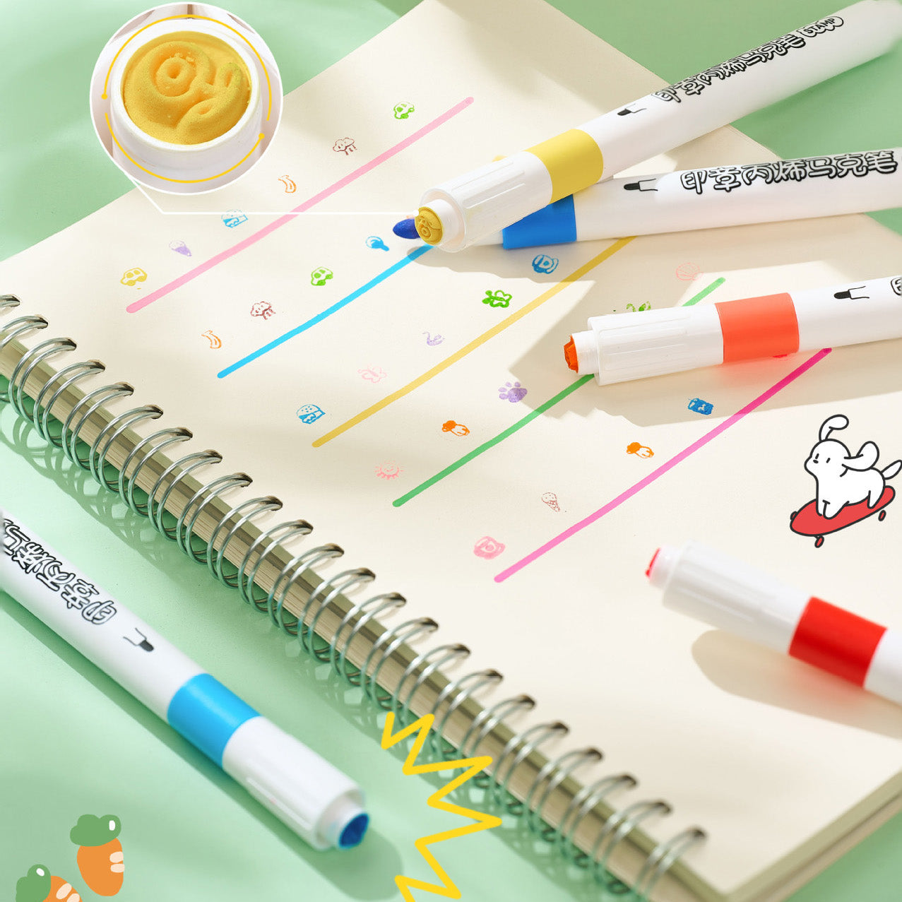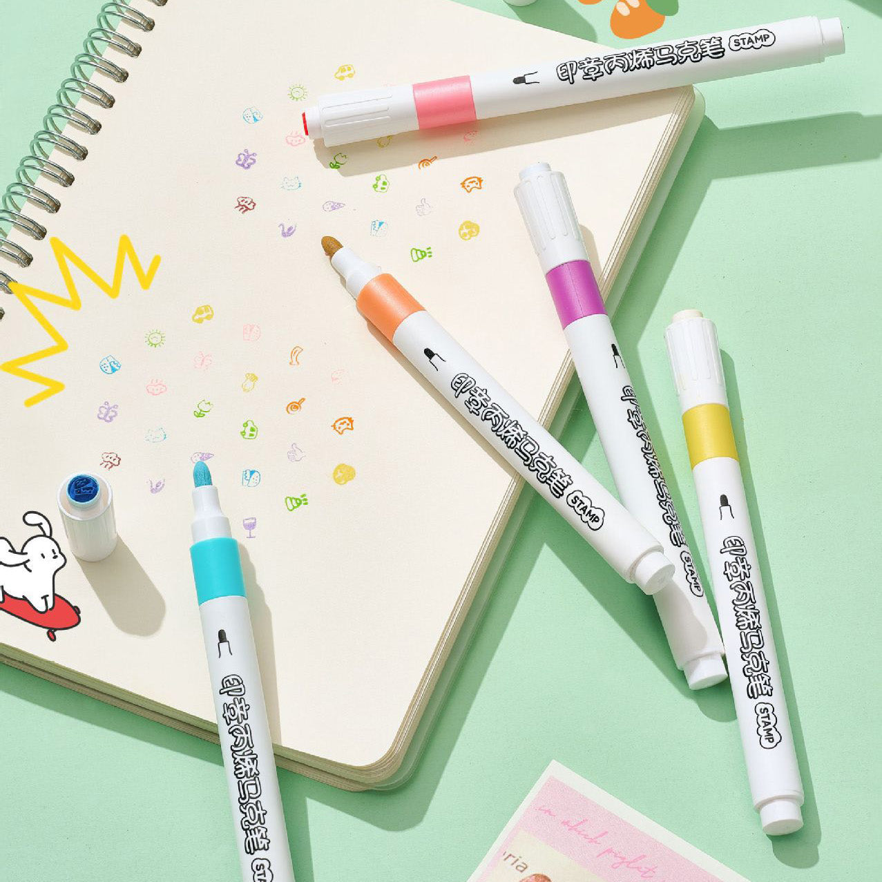 Dale un toque creativo y súper tierno a tus notas, agendas o dibujos con este set de marcadores doble punta: por un lado, punta tipo marcador para hacer líneas y colorear; y por el otro, un sello con figuras adorablemente detalladas. Cada marcador incluye un diseño único que imprime íconos como corazones, caritas, animalitos, dulces y más, perfectos para decorar bullet journals, tarjetas o apuntes escolares.