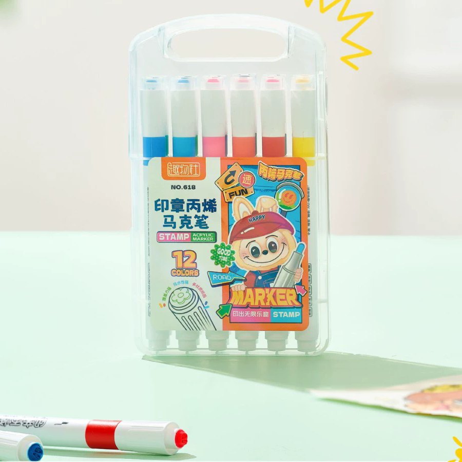El estuche trae 12 colores vibrantes que no traspasan fácilmente el papel y ofrecen un trazo suave. Los sellos incorporados funcionan sin almohadilla, lo que los hace limpios, prácticos y listos para usar en cualquier momento.