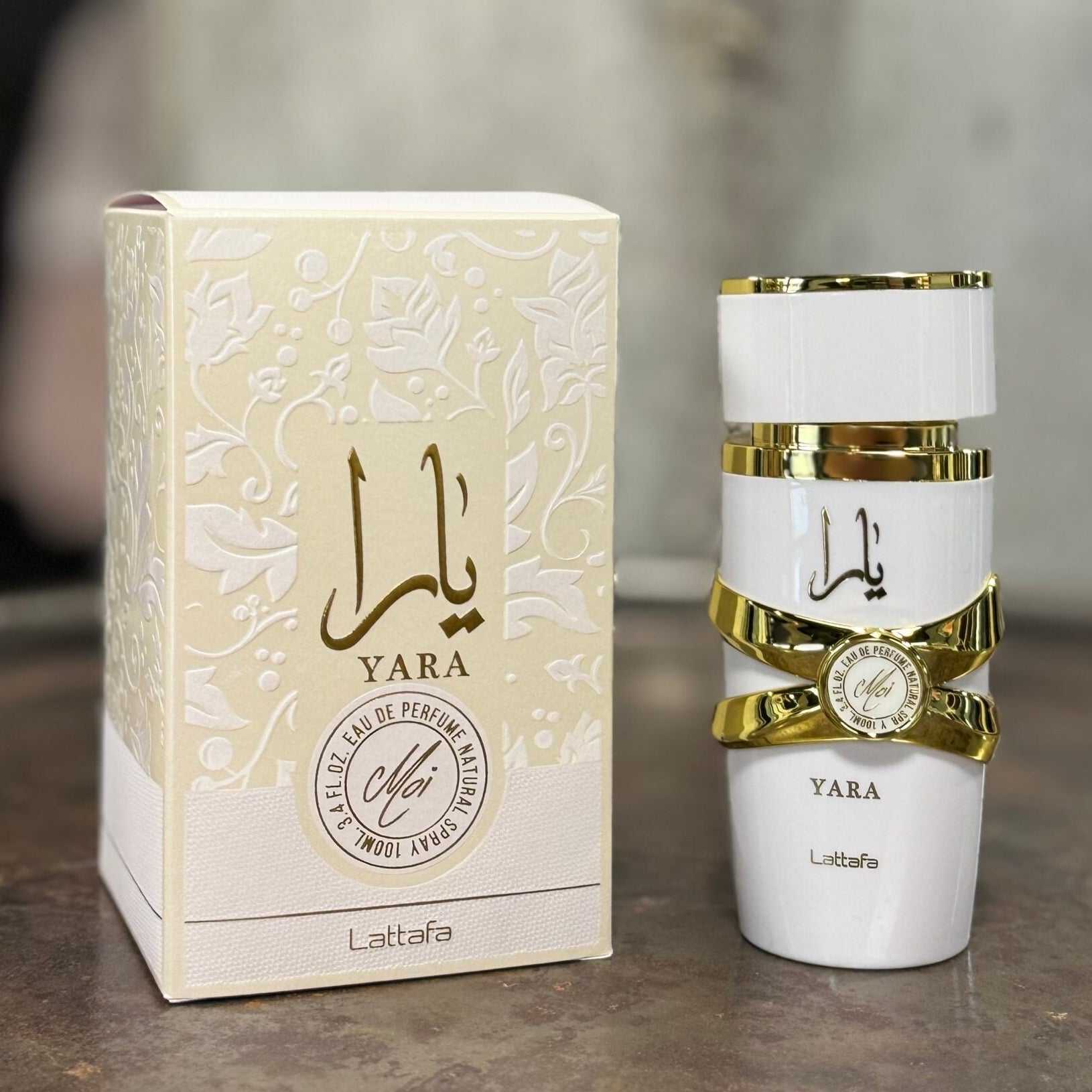 - El perfume Yara Moi de 100ml, es una fragancia de la familia olfativa para Mujeres. Las Notas de Salida son jazmín y durazno (melocotón); las Notas de Corazón son caramelo y ámbar; las Notas de Fondo son pachulí y sándalo.