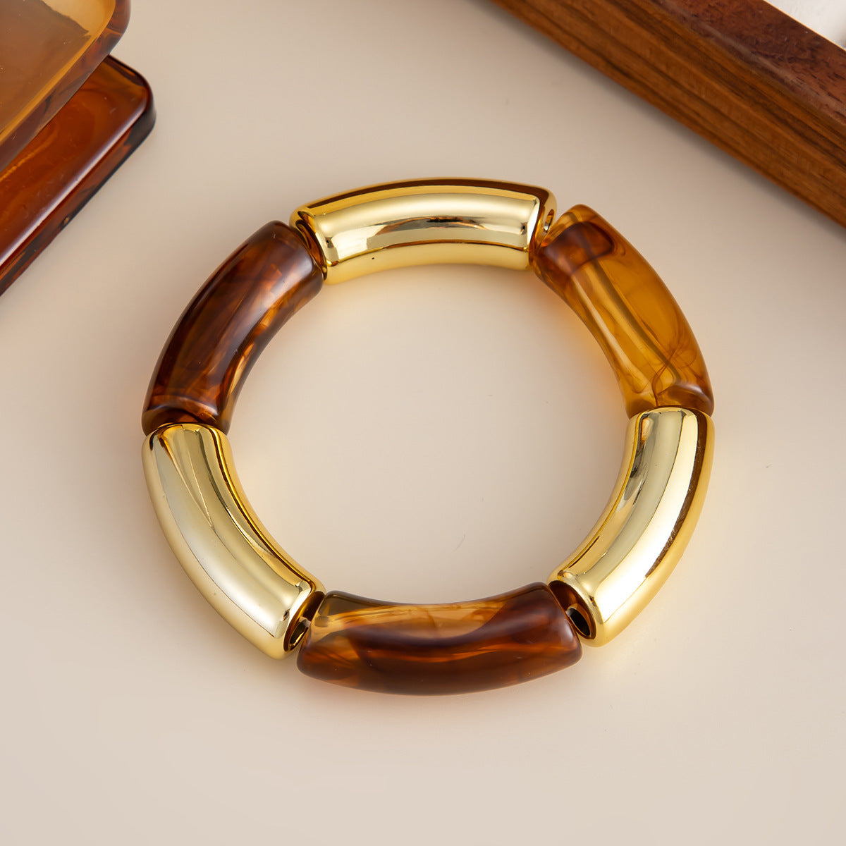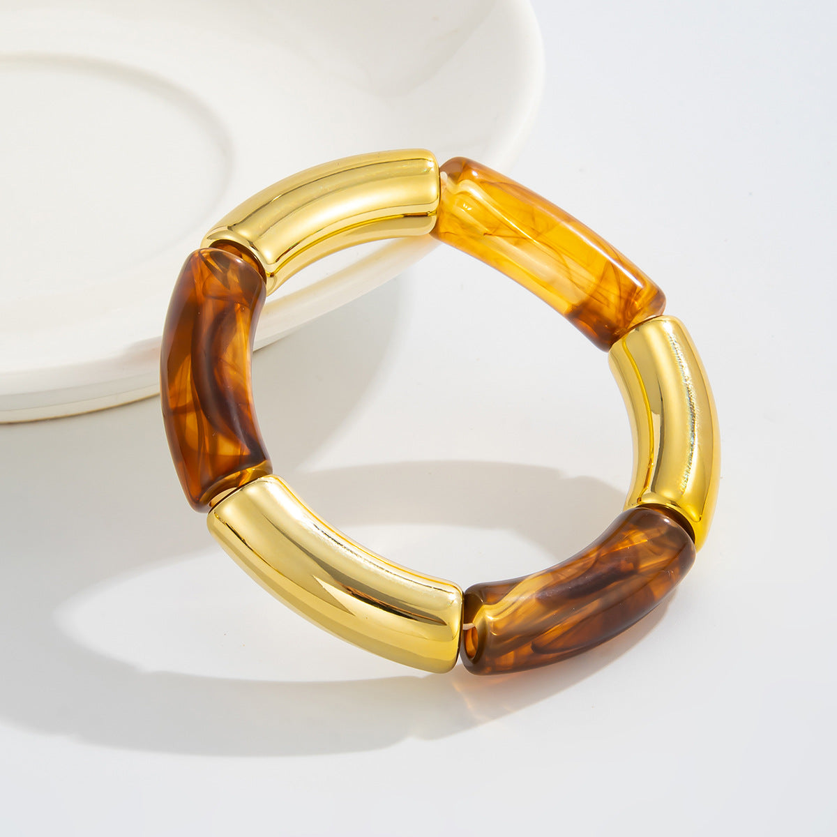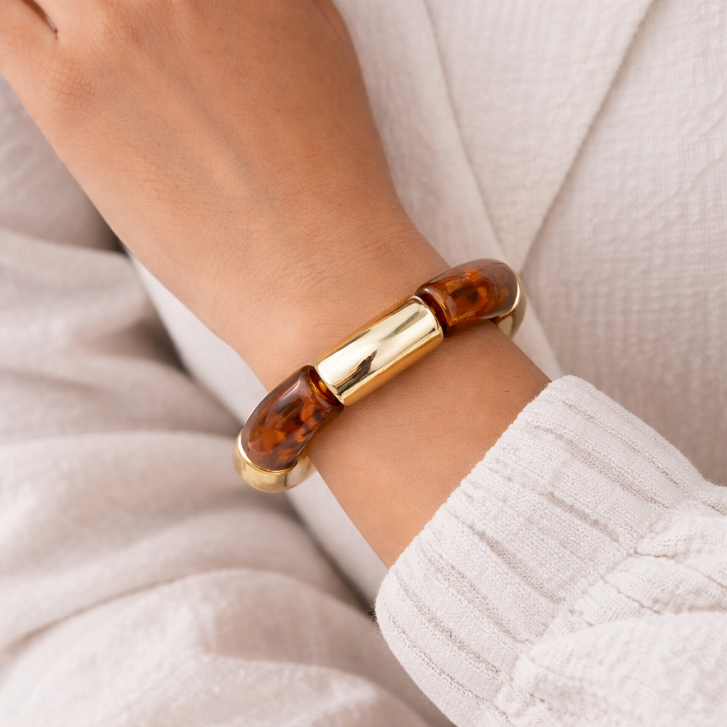 Esta pulsera destaca por su diseño elegante y contemporáneo que combina piezas efecto carey en tonos ámbar con eslabones metálicos dorados de acabado brillante. Su mezcla de materiales y colores crea un contraste sofisticado que eleva cualquier look, desde outfits neutros y minimalistas hasta estilos más audaces y nocturnos.