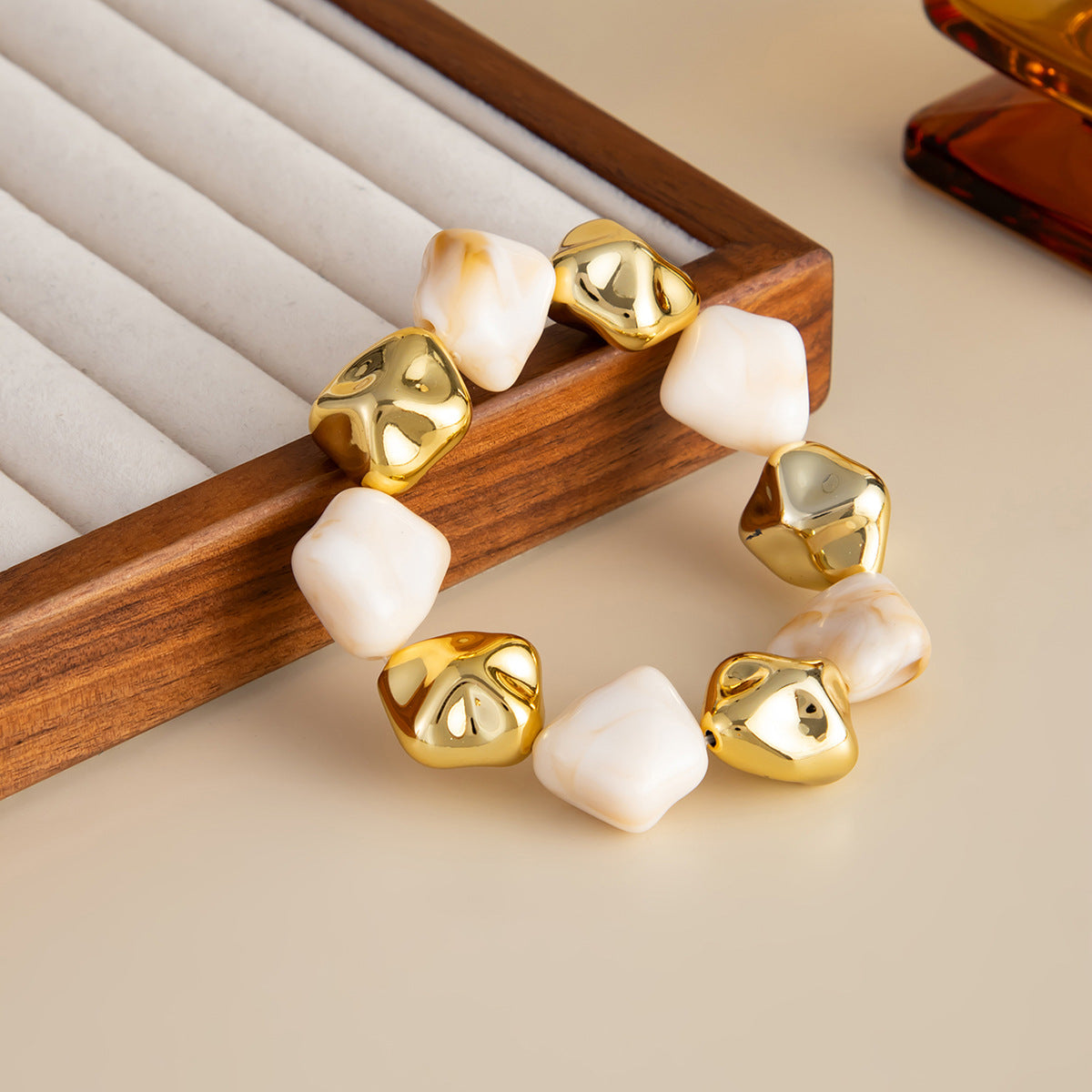 Esta pulsera destaca por su diseño moderno y elegante que combina piezas de resina blanca con un suave efecto marmoleado junto a elementos metálicos dorados de acabado brillante. Su forma orgánica e irregular aporta un estilo sofisticado pero relajado, ideal para elevar cualquier outfit con un toque luminoso y actual.