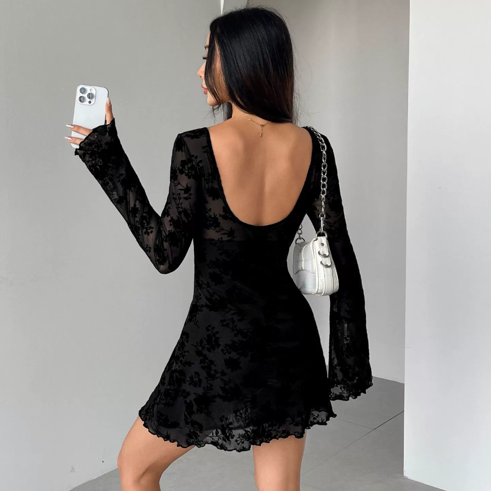 Un diseño sofisticado que combina texturas y estilo. Este vestido mini negro destaca por su escote redondo con delicados cortes frontales ajustados con lazos, mangas largas acampanadas en tela transparente y un patrón floral en terciopelo que aporta elegancia. El dobladillo ligeramente rizado añade un toque femenino, ideal para ocasiones especiales o noches con estilo.