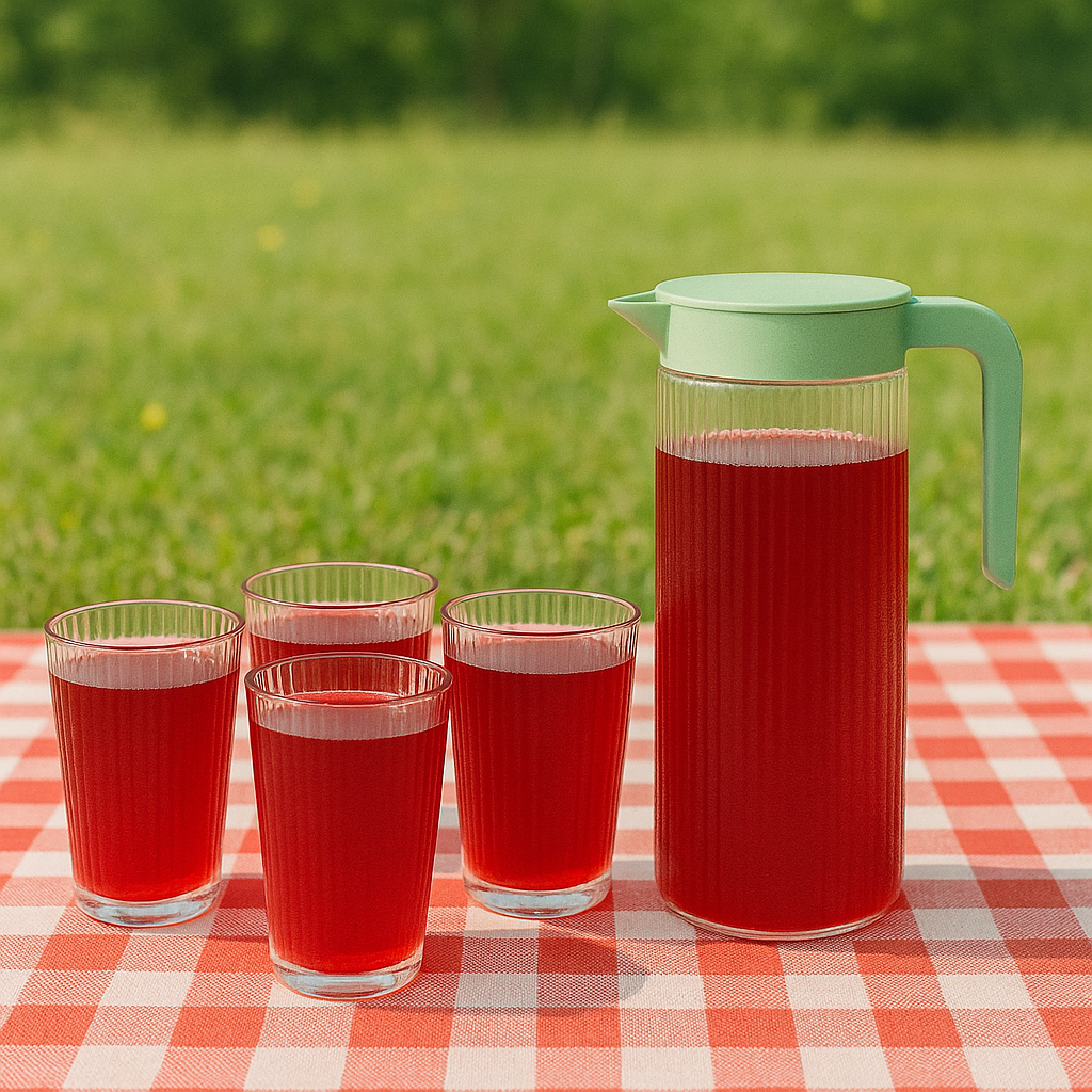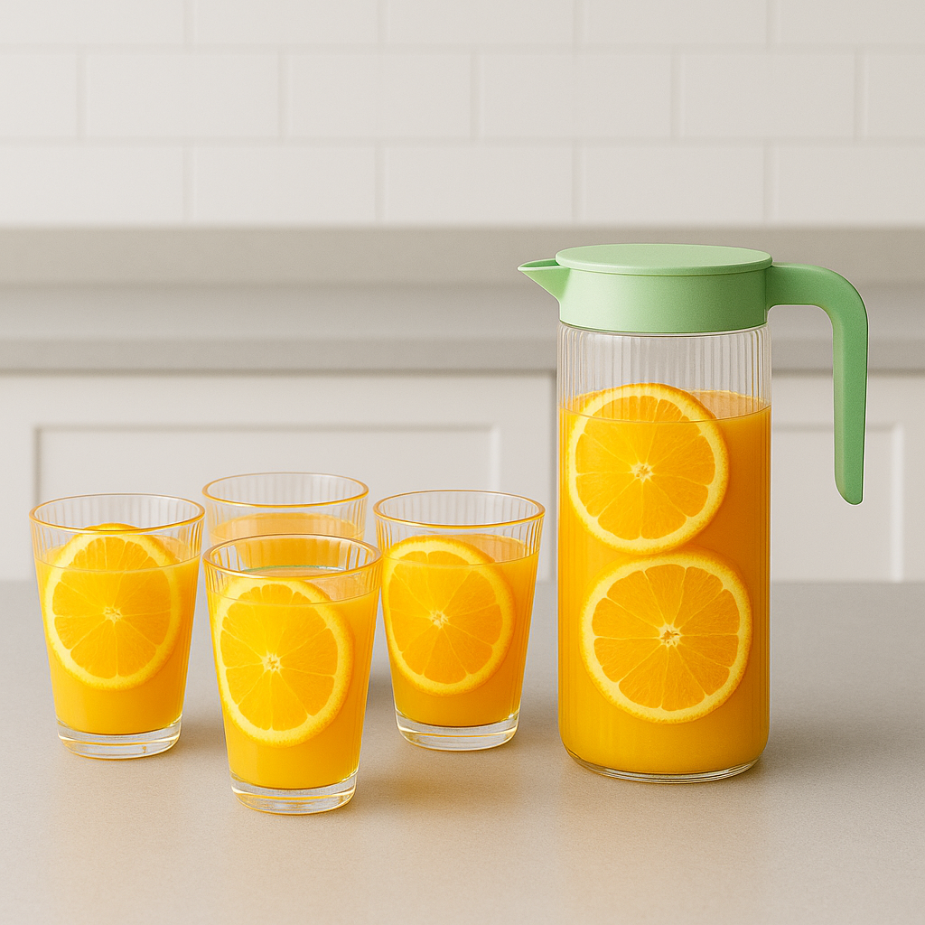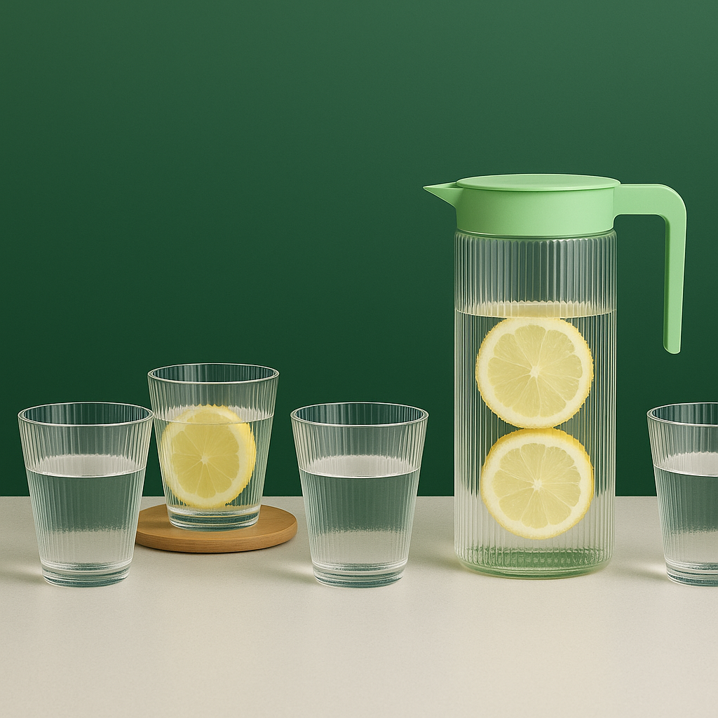 Incluye una jarra con tapa verde y 4 vasos a juego, perfectos para servir agua, jugos, té frío o limonada con estilo.