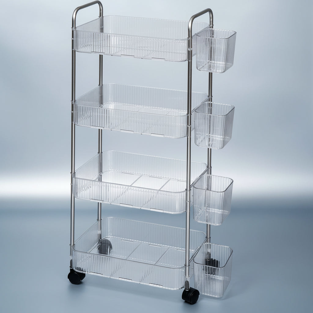 Optimiza tus espacios con este carrito organizador de cuatro niveles, diseñado para mantener todo en orden con un estilo moderno y minimalista. Su estructura metálica y bandejas transparentes lo convierten en una pieza versátil para cualquier ambiente del hogar u oficina.