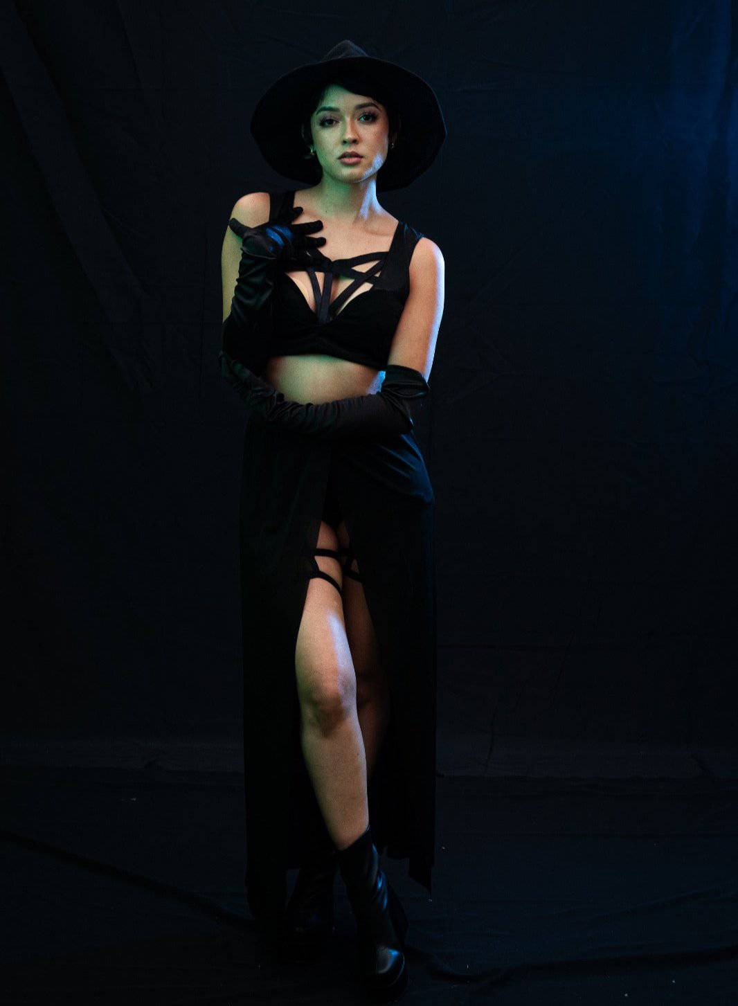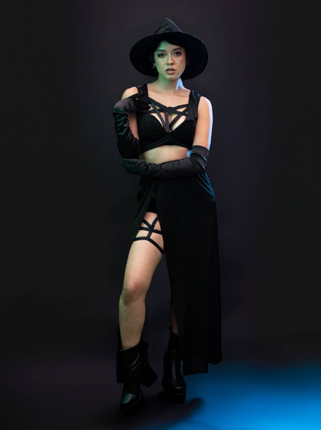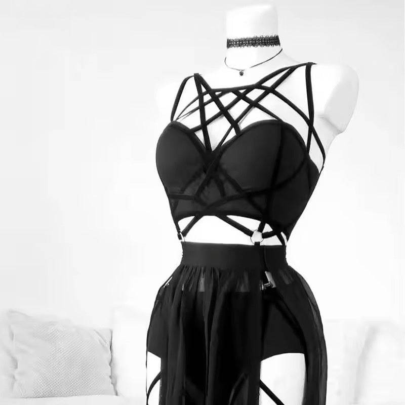 Conjunto de lencería perfecto para lucir en una fiesta de disfraces o en Halloween. Este conjunto sexy y atrevido está diseñado en color negro y está compuesto por 5 piezas de tela de poliéster stretch que se ajustan perfectamente a tu cuerpo.