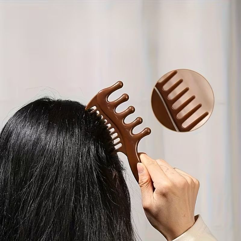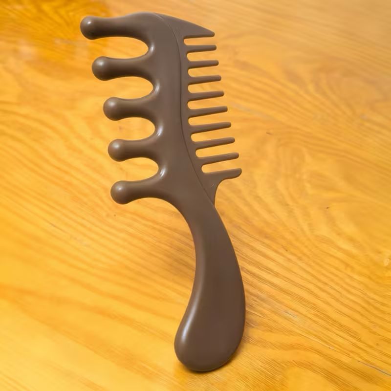 Un accesorio práctico que combina el cuidado del cabello con el bienestar del cuero cabelludo. Su diseño único incluye dientes anchos para desenredar suavemente y cinco puntas redondeadas que funcionan como masajeador, estimulando la circulación y brindando una sensación relajante.