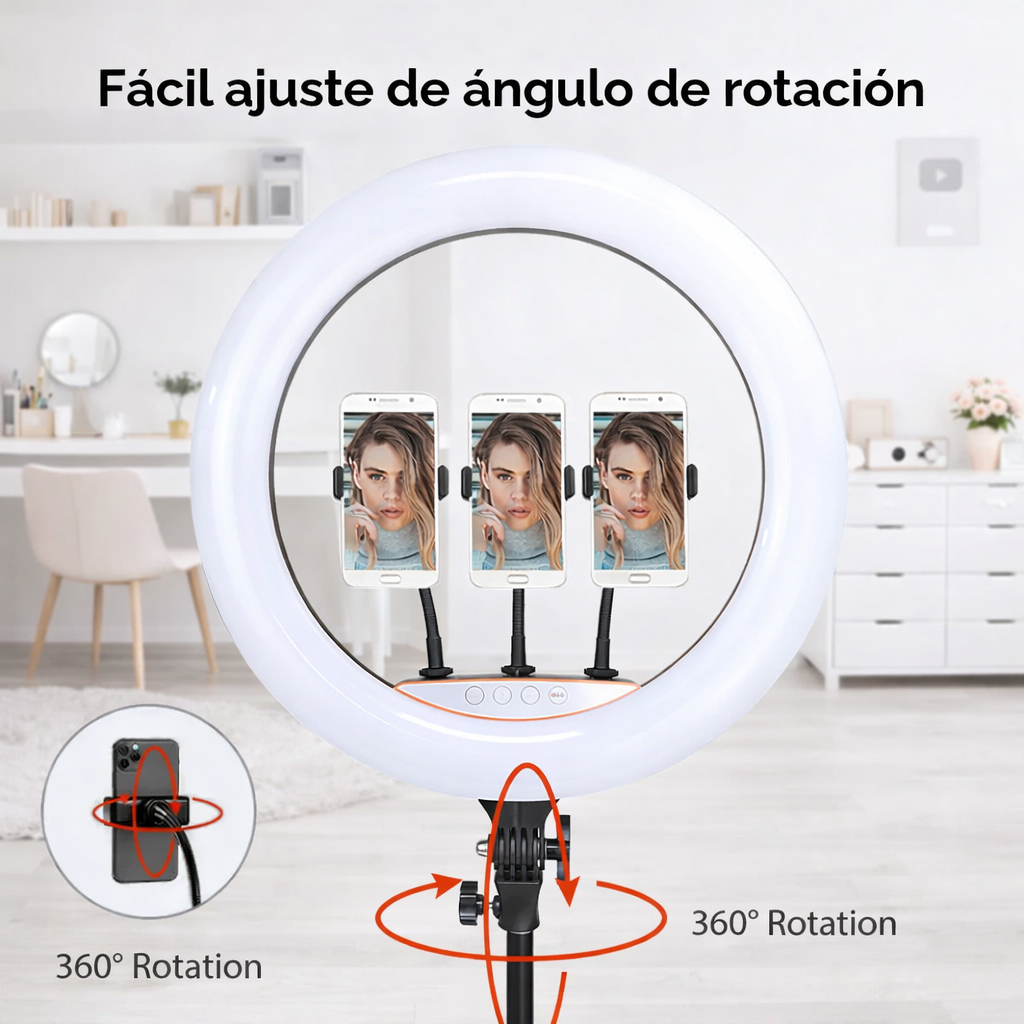 Incluye trípode ajustable en altura, tres soportes flexibles para celular y control remoto para cambiar colores, intensidad y modos sin interrumpir la grabación. Su rotación 360° y luz suave sin parpadeo reducen sombras duras y mejoran la definición del rostro, ideal para maquillaje, contenido digital, streaming o fotografía profesional.