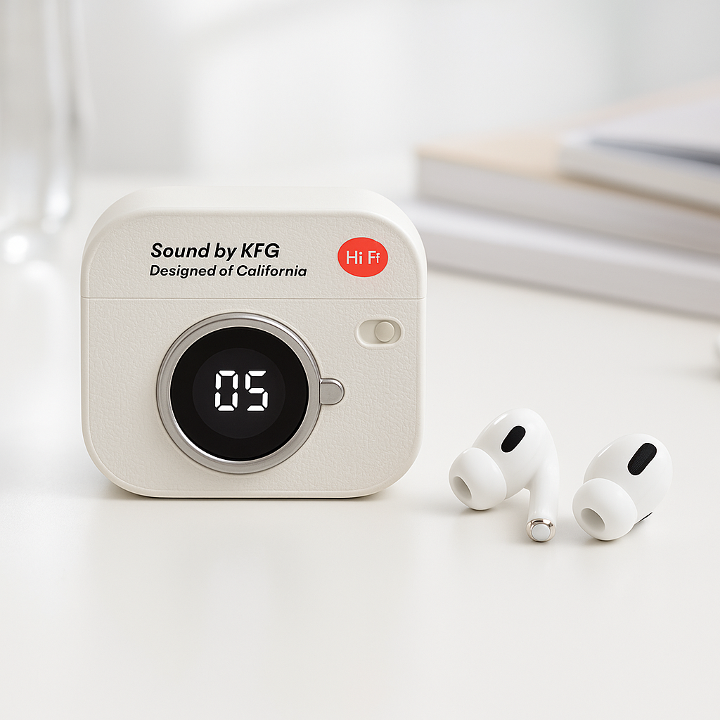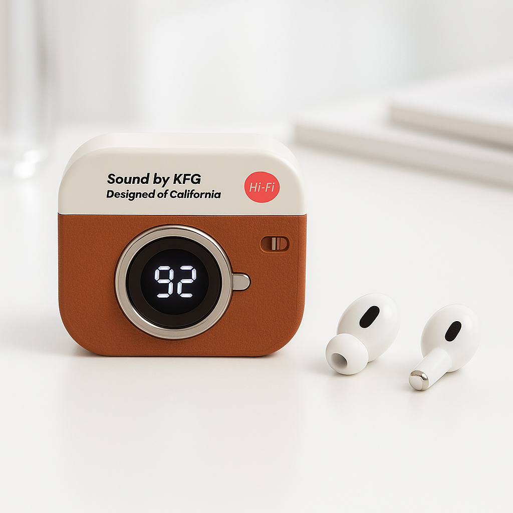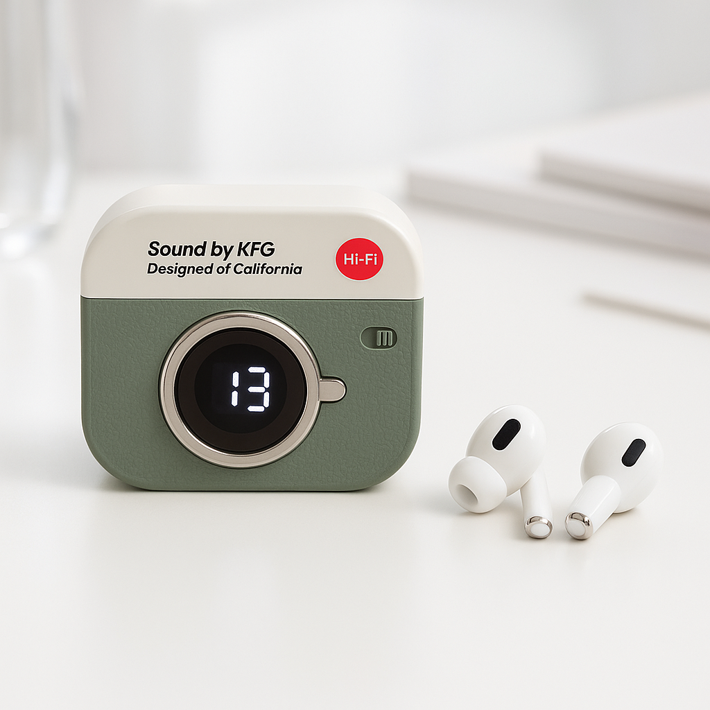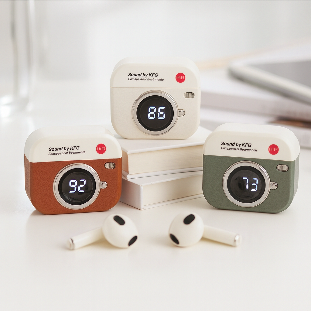 Los audífonos inalámbricos Retro Cam combinan tecnología moderna con un look vintage aesthetic. Su estuche con diseño de cámara y pantalla LED muestra el nivel de batería con estilo, mientras que su conexión Bluetooth 5.49 garantiza una experiencia fluida, estable y sin cables.