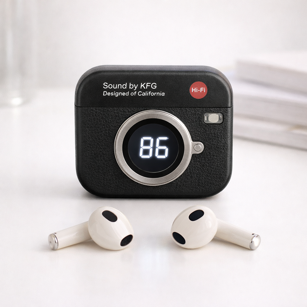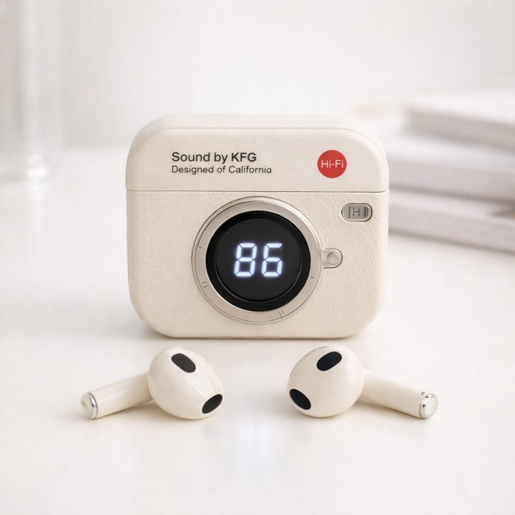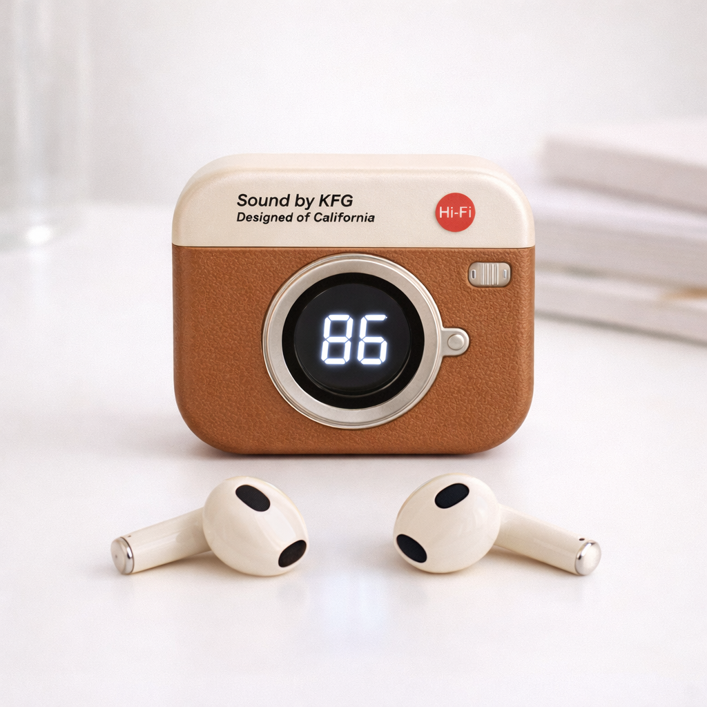 Los audífonos inalámbricos Retro Cam combinan tecnología moderna con un look vintage aesthetic. Su estuche con diseño de cámara y pantalla LED muestra el nivel de batería con estilo, mientras que su conexión Bluetooth 5.49 garantiza una experiencia fluida, estable y sin cables.