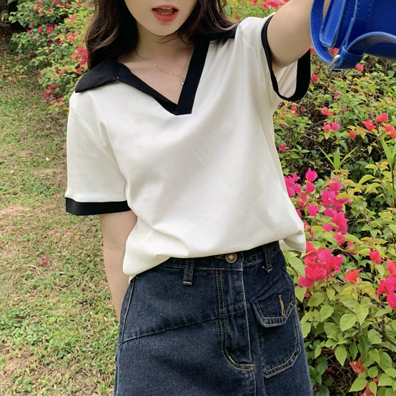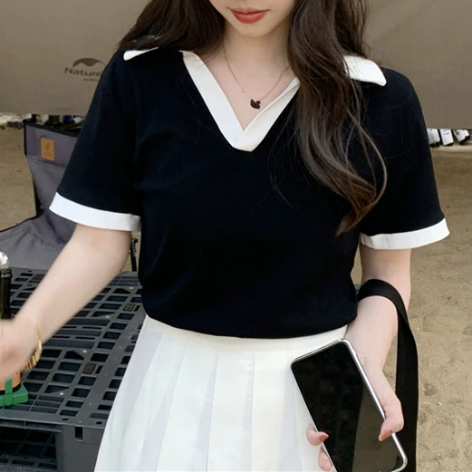 La Blusa Cuello Tipo Polo Contraste combina un diseño clásico con un toque moderno y femenino. Su cuello amplio con detalle en color contrastante enmarca el escote con delicadeza, mientras que las mangas cortas con acabado bicolor aportan estructura y estilo.