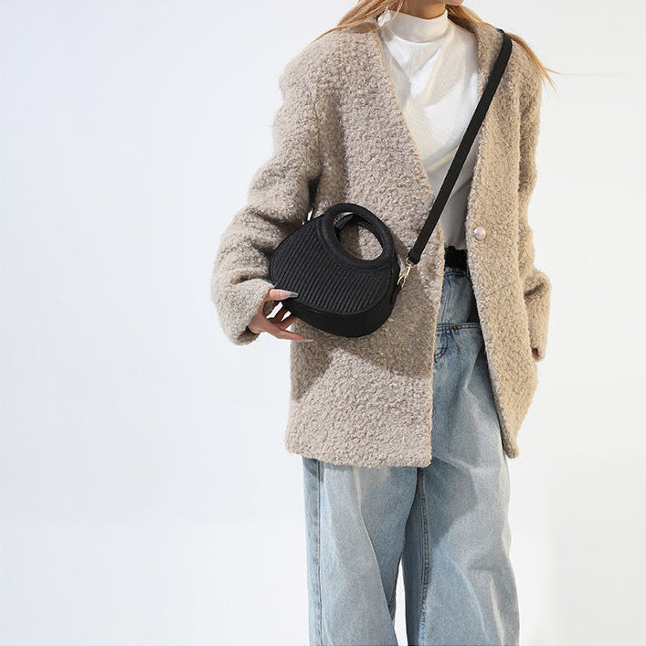 El bolso circular de fieltro combina textura suave, estructura moderna y estilo minimalista.