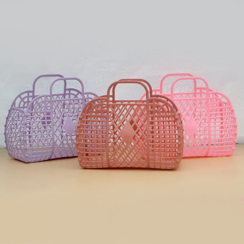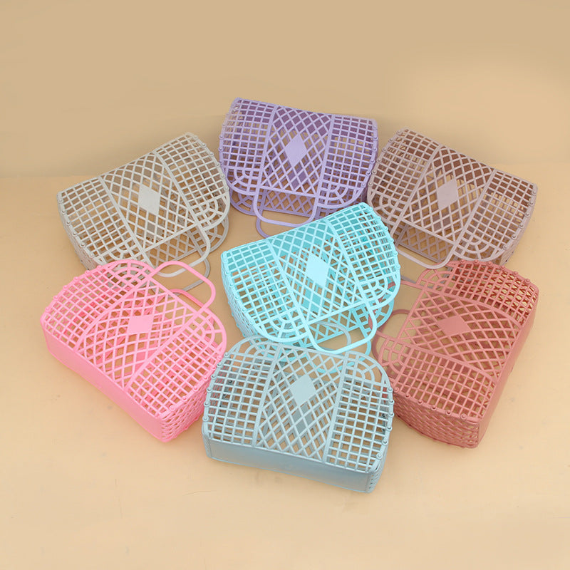 Esta mini bolsa plástica estilo canasta es el toque más cute y nostálgico para tu espacio. Con su diseño de rejilla vintage y colores pastel soñados, es perfecta para decorar tocadores, escritorios, habitaciones infantiles o incluso usar como mini organizador para accesorios pequeños.