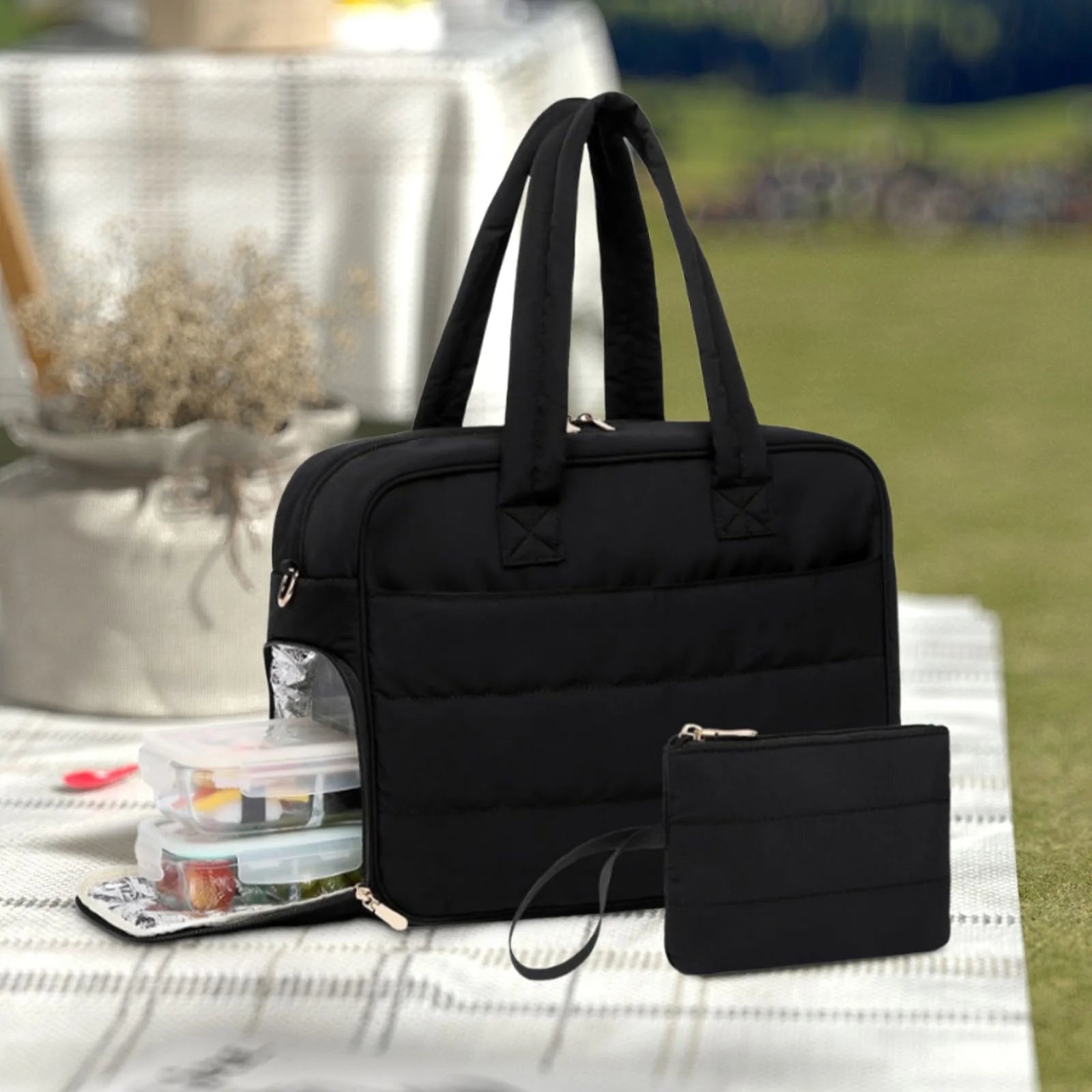 Diseñada para acompañarte en tu rutina diaria, esta bolsa tote multifuncional combina estilo, practicidad y organización en un solo diseño. Su estructura elegante tipo acolchado la hace perfecta para llevar a la oficina, universidad o viajes, manteniendo una apariencia sofisticada sin sacrificar funcionalidad. Cuenta con un compartimento térmico independiente que permite transportar alimentos y bebidas de forma segura, sin mezclarlos con tus objetos personales.