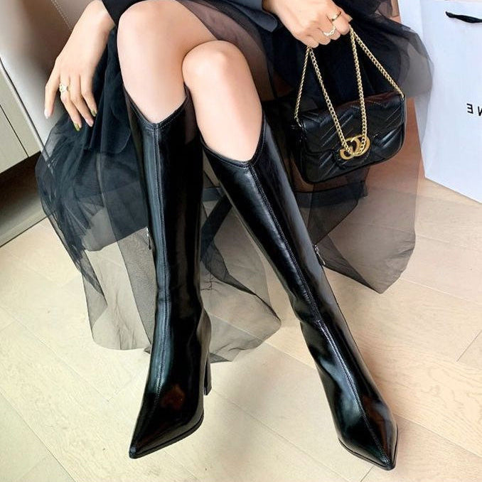 Diseñadas para las chicas que aman destacar con elegancia y actitud, estas botas combinan el clásico negro brillante con un corte moderno en punta y un tacón block que estiliza sin sacrificar comodidad.