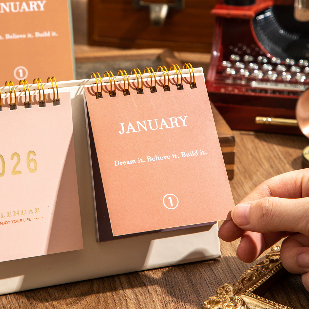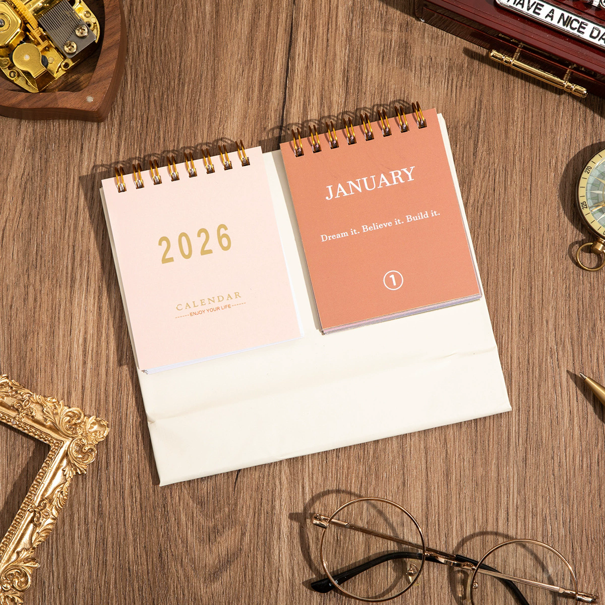El calendario de escritorio 2026 es una pieza funcional y decorativa diseñada para organizar tu año con estilo. Cuenta con estructura plegable tipo soporte y espiral metálico dorado que permite cambiar las hojas fácilmente mes a mes. Su diseño minimalista combina tonos neutros y elegantes, ideal para escritorios de oficina, home office o espacios de estudio.