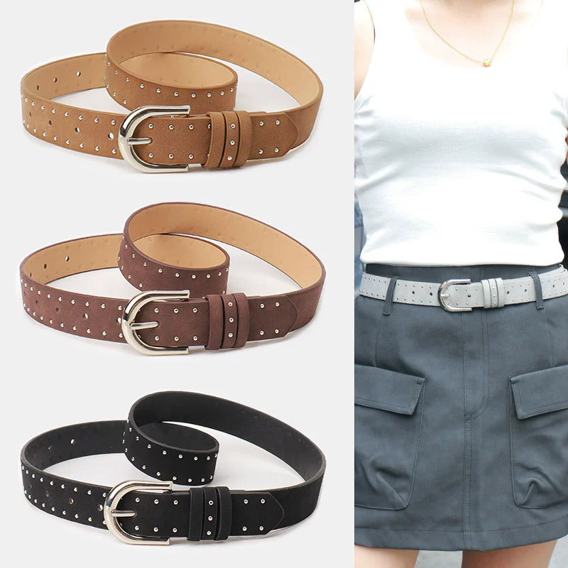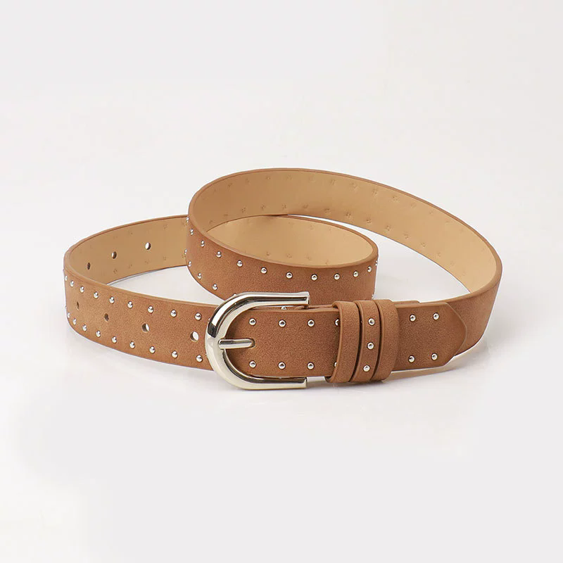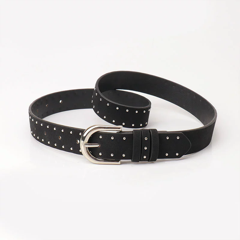 Este cinturón con tachas metálicas combina elegancia y estilo moderno en una sola pieza. Su diseño delicado con mini apliques plateados lo convierte en el accesorio perfecto para realzar cualquier look, desde jeans y shorts hasta faldas o vestidos. La hebilla metálica curva aporta un toque sofisticado sin perder la frescura del estilo casual.