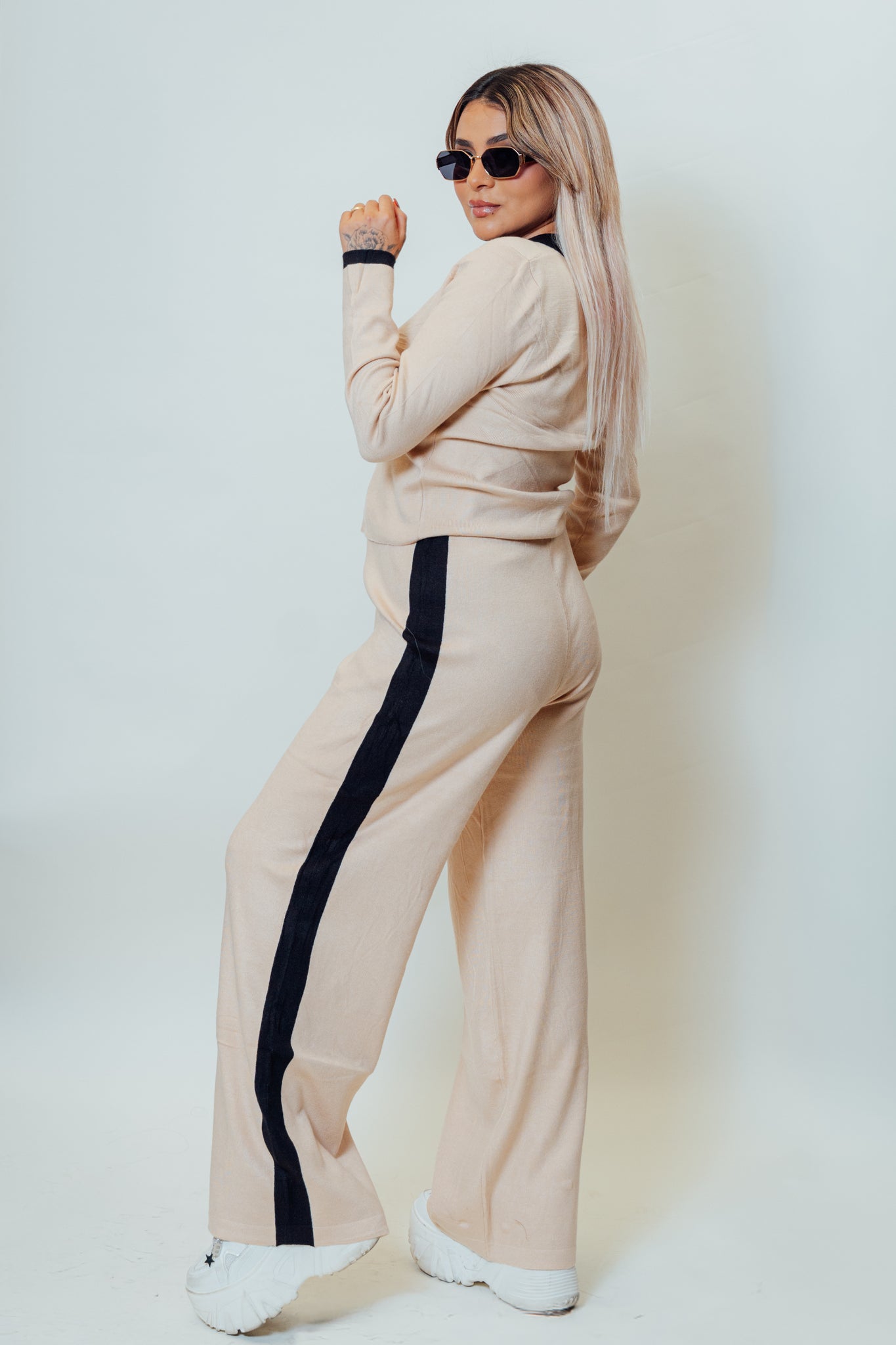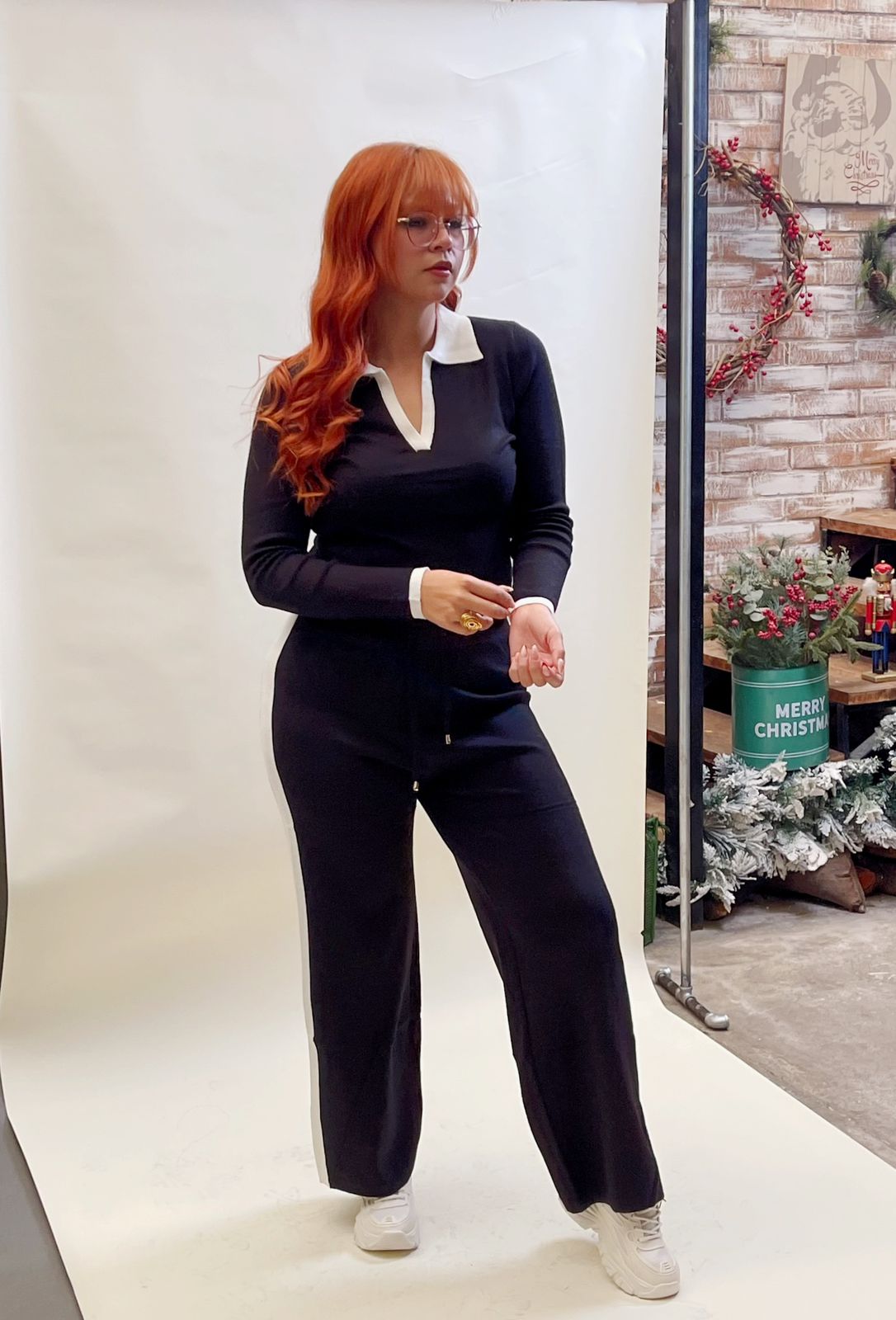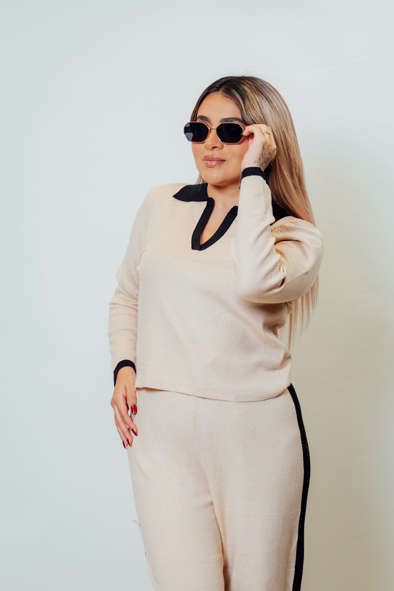 Conjunto de dos piezas tejido con estilo moderno y versátil. Ideal para crear looks casuales con un toque chic, manteniendo la comodidad durante todo el día. Perfecta para cualquier temporada. blusa de cuello y manga larga
