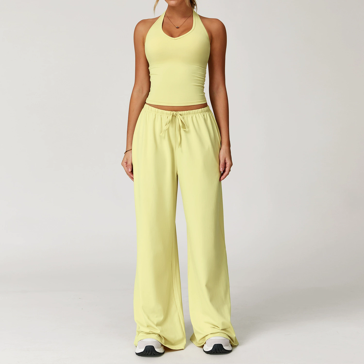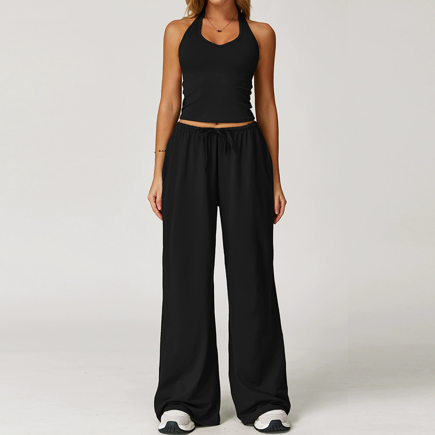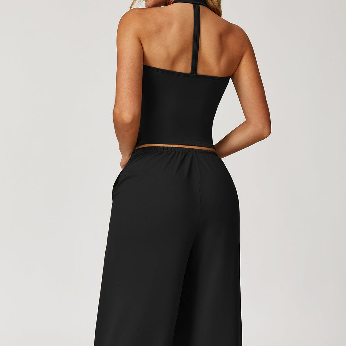 Este set es la definición perfecta de comodidad con estilo. Compuesto por un top halter ajustado y un pantalón de pierna amplia, crea una silueta favorecedora que estiliza sin sacrificar libertad de movimiento. Su diseño minimalista lo convierte en una opción versátil para usar en casa, salir por un café o armar un look relajado pero pulido.