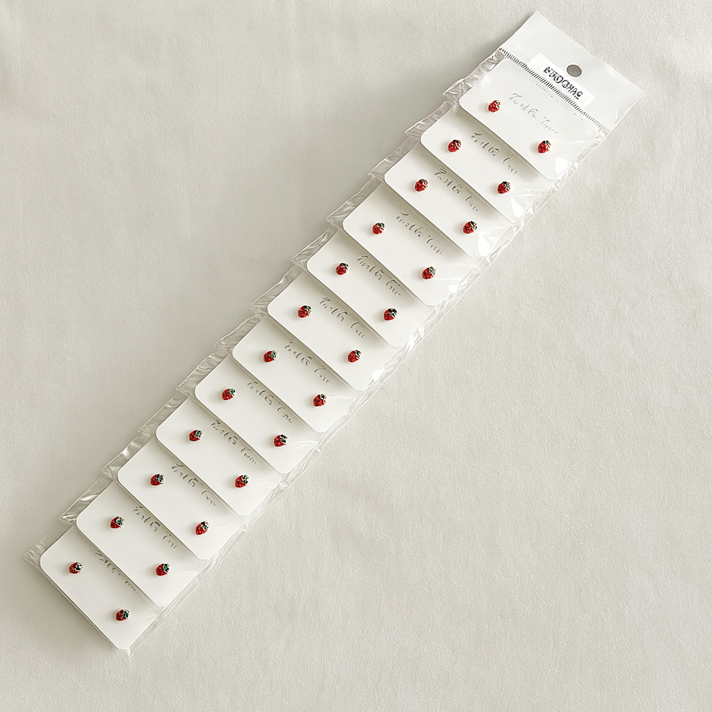 Este paquete incluye 12 pares de aretes mini de fresa, perfectos para venta al por menor, regalos grupales o para tener tus propios repuestos ultra cute.