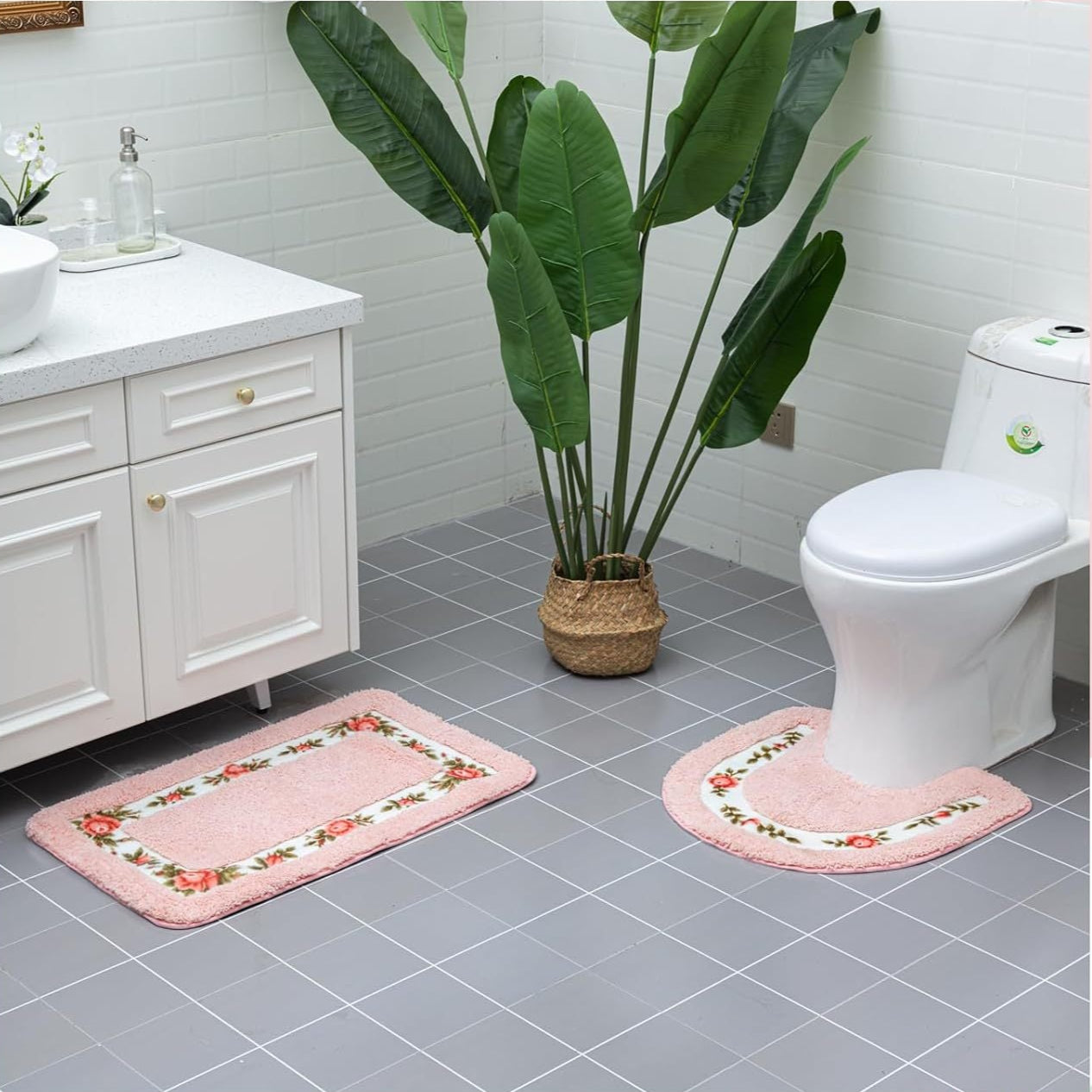 Decora tu baño con un toque romántico y elegante con este set de alfombras de baño rosas con diseño floral.