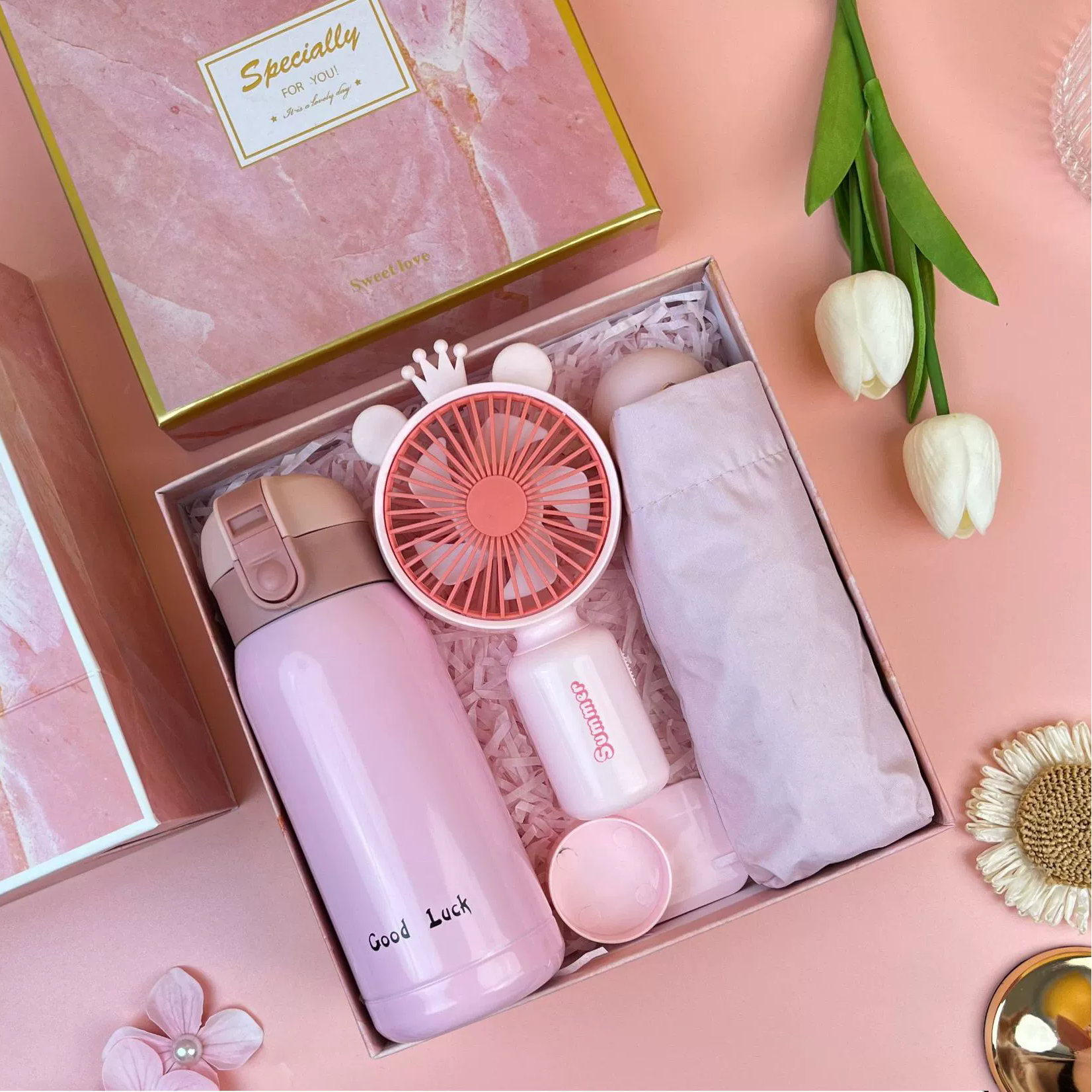 Esta elegante caja de regalo reúne tres esenciales que combinan estilo, utilidad y diseño cute: un termo resistente y portable, un mini ventilador recargable con orejitas decorativas y un paraguas compacto perfecto para llevar a todos lados. Cada pieza está diseñada para acompañar el día a día con un toque moderno, juvenil y práctico.