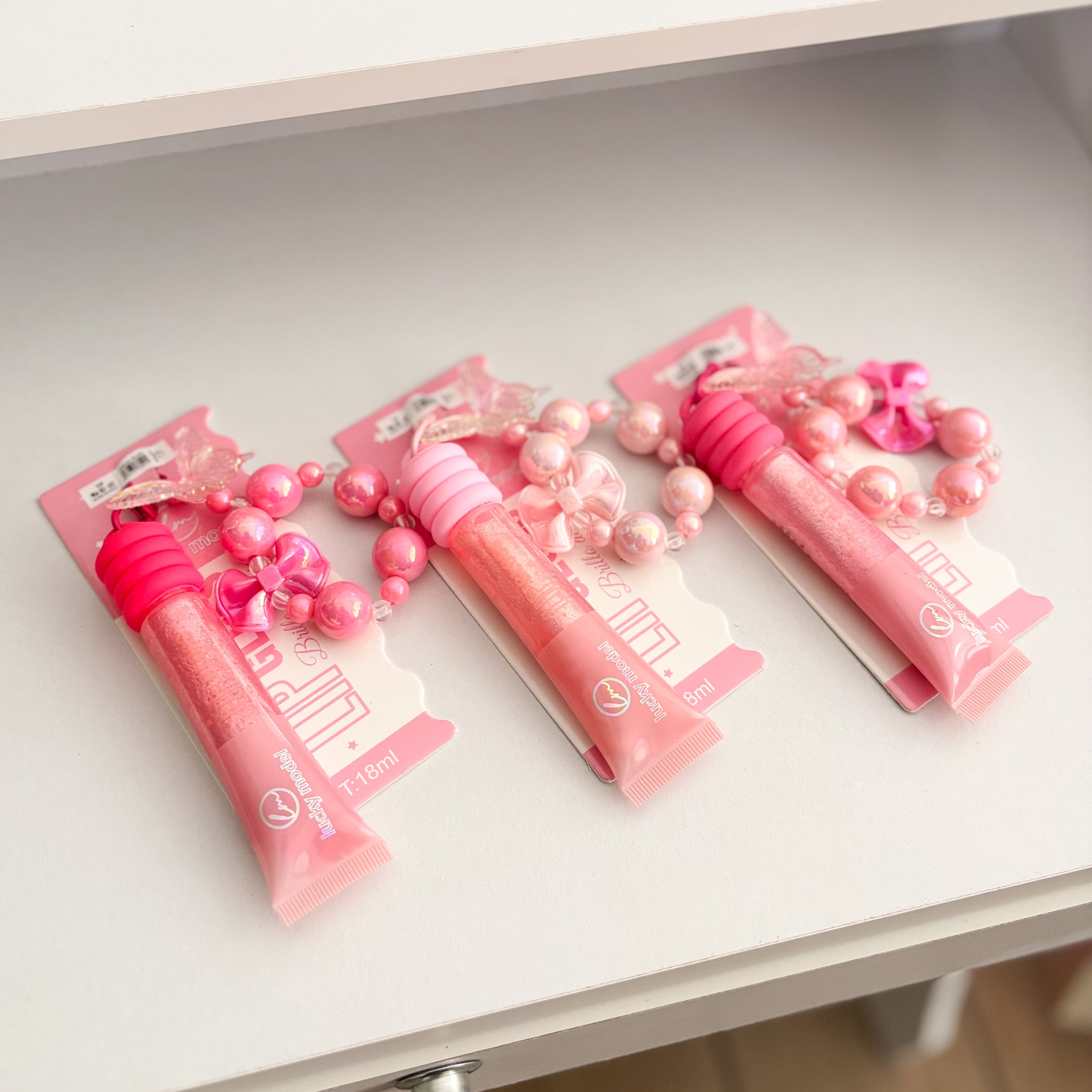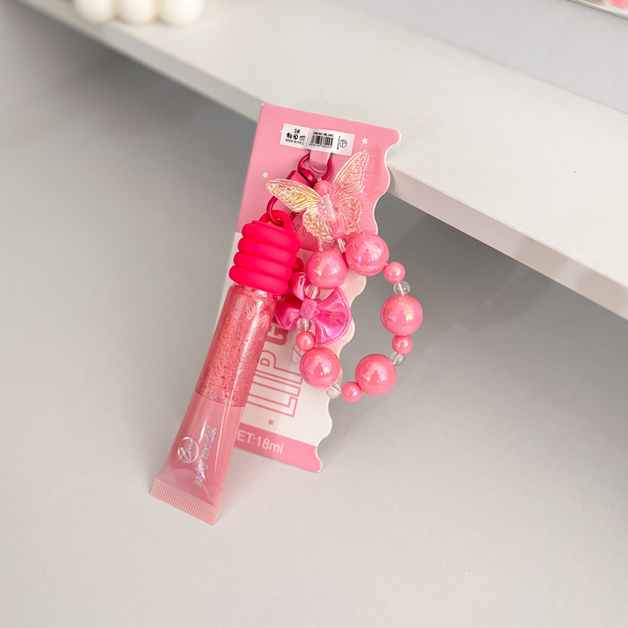 Dale a tus labios un toque dulce y brillante con este lip gloss Lucky Model. Su fórmula ligera aporta brillo instantáneo y un acabado jugoso que realza el color natural de los labios. Además, viene acompañado de un adorable llavero de perlas con detalles de moños y mariposas, perfecta para complementar tu estilo más girly.