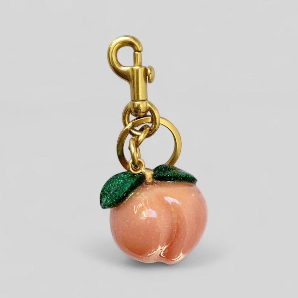Agrega un toque frutal y brillante a tu día con este llavero de durazno. Su acabado glossy y hojas con glitter lo hacen el accesorio perfecto para bolsos, mochilas o llaves.