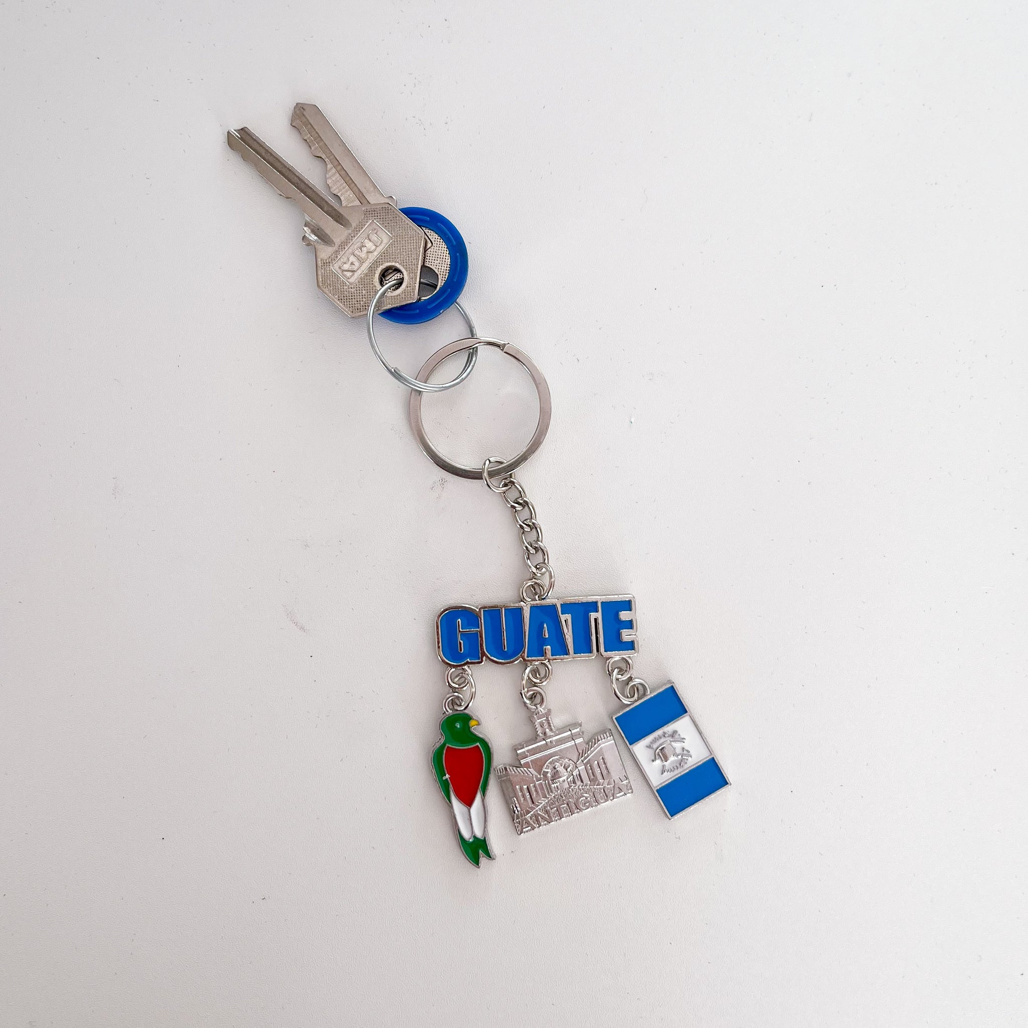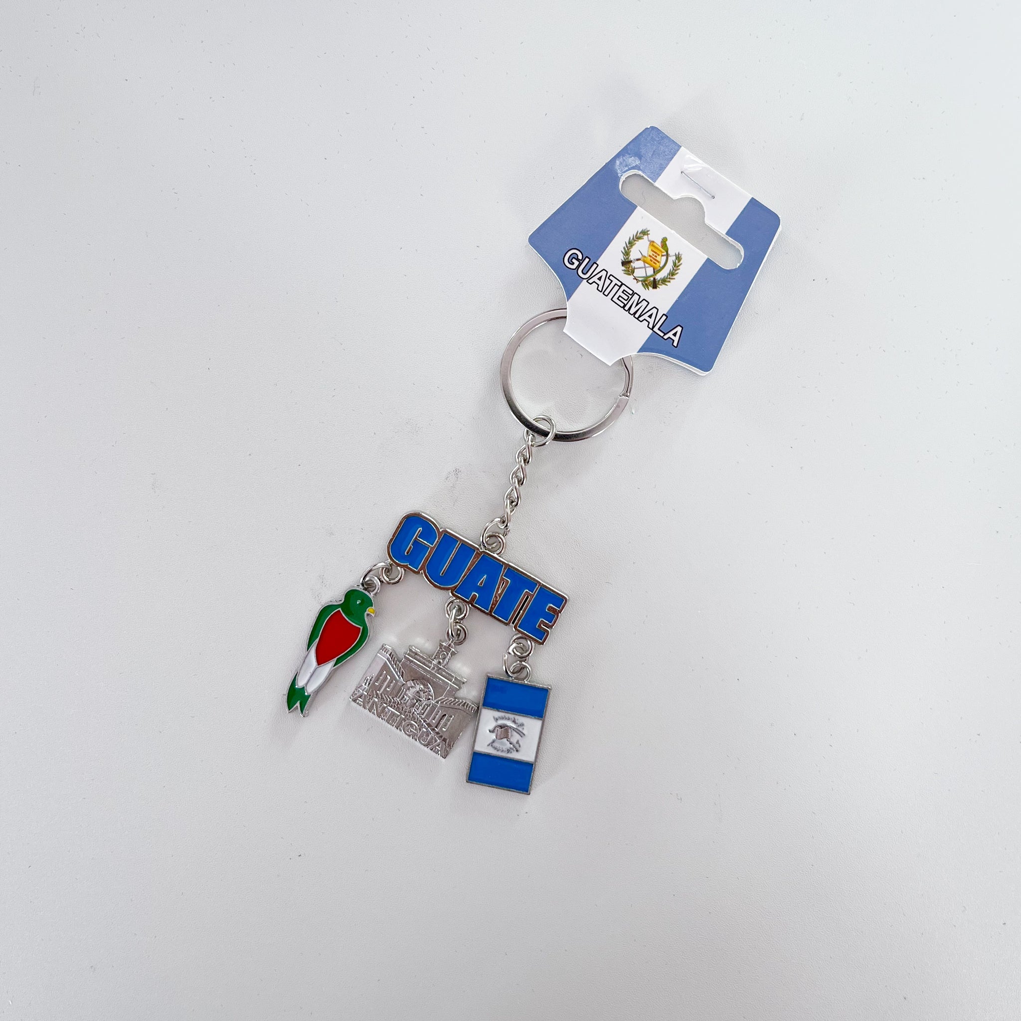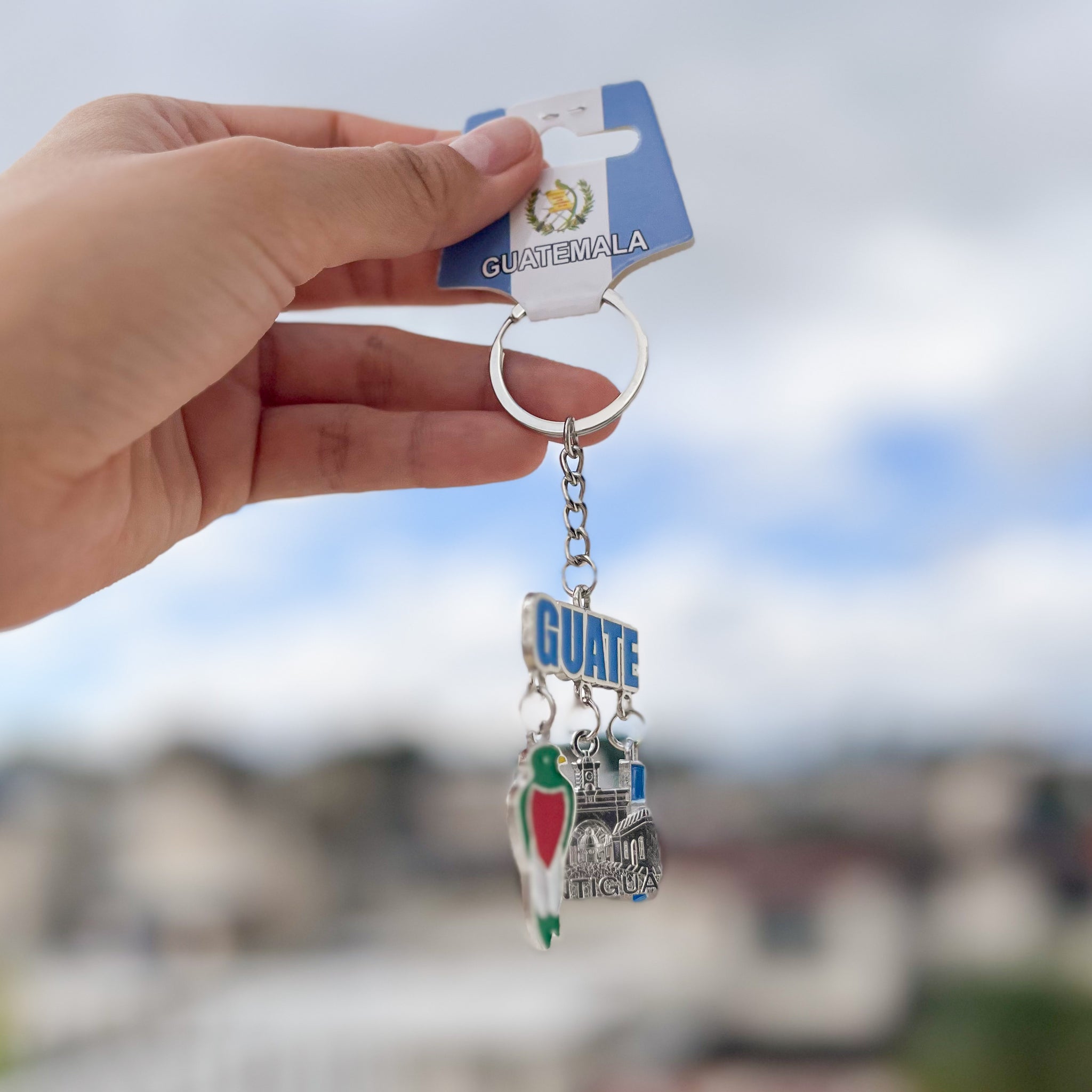 Este llavero turístico de Guatemala está diseñado con tres dijes emblemáticos que representan la cultura del país: un quetzal colorido, un monumento de Antigua Guatemala y la bandera nacional. Su diseño vibrante y detallado lo convierte en un accesorio perfecto para acompañar tus llaves, mochila o bolso, aportando un toque de identidad y orgullo guatemalteco a tu día a día.