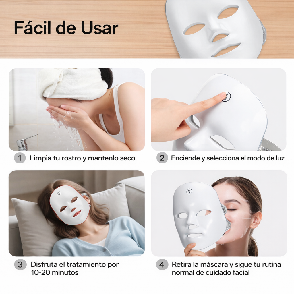 La mascarilla con luz LED es un dispositivo de fototerapia diseñado para mejorar visiblemente la apariencia de la piel desde casa. Utiliza tecnología de luz con múltiples tonos que ayudan a tratar imperfecciones, disminuir la apariencia de poros y aportar luminosidad al rostro. Su diseño ergonómico cubre completamente la cara para una distribución uniforme de la luz.
