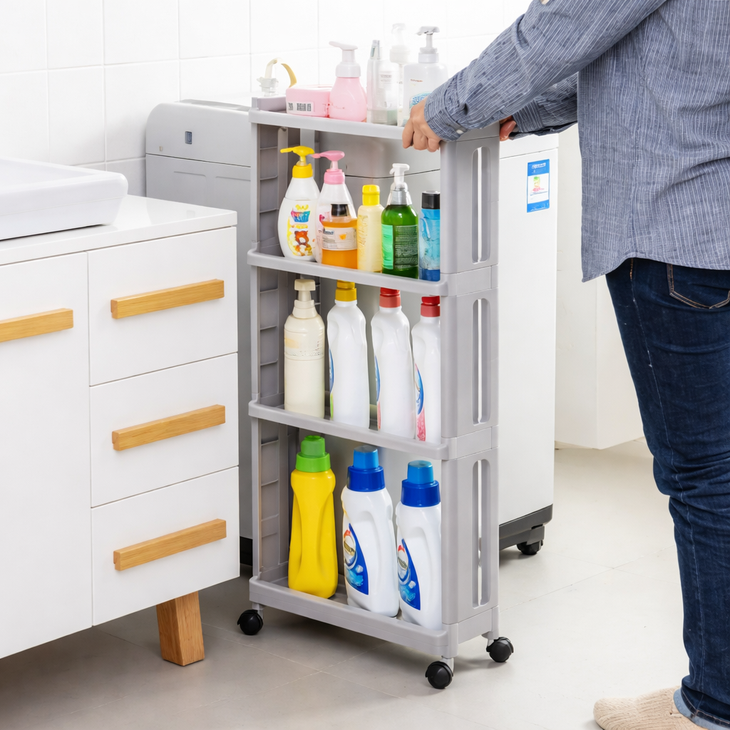 El organizador vertical de 4 niveles es la solución ideal para maximizar espacios reducidos sin perder funcionalidad. Su diseño vertical y estrecho permite colocarlo fácilmente entre muebles, junto al refrigerador, en el baño o en la lavandería.