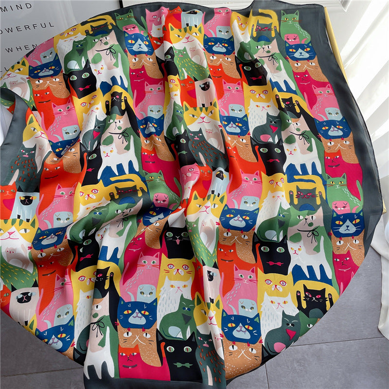 Este pañuelo cuadrado con estampado de gatos multicolor es el accesorio perfecto para elevar cualquier outfit con un toque artístico y divertido. Su diseño vibrante combina ilustraciones modernas de gatitos en tonos rojo, verde, azul, amarillo y rosa, creando una pieza llamativa que roba miradas al instante.
