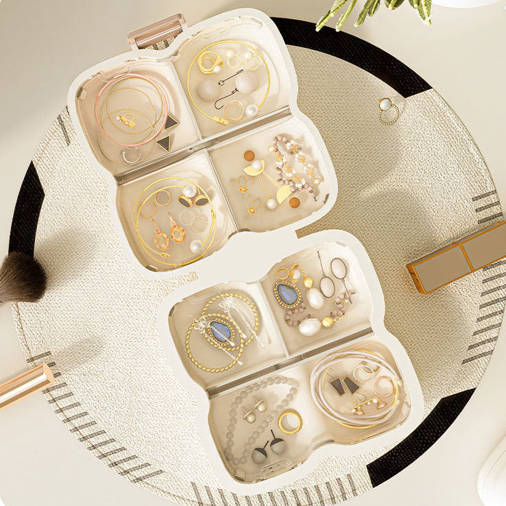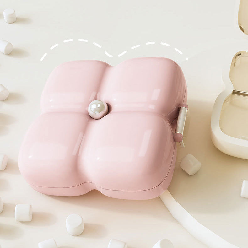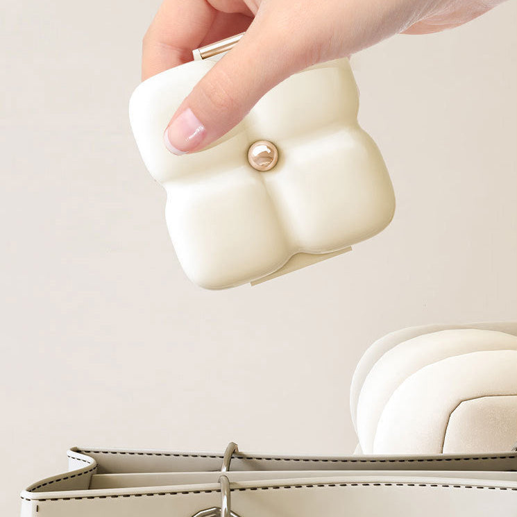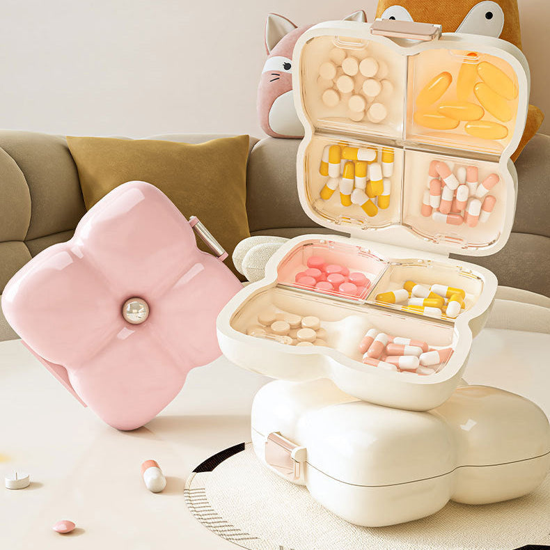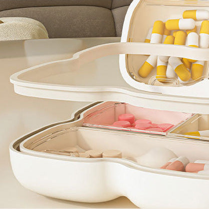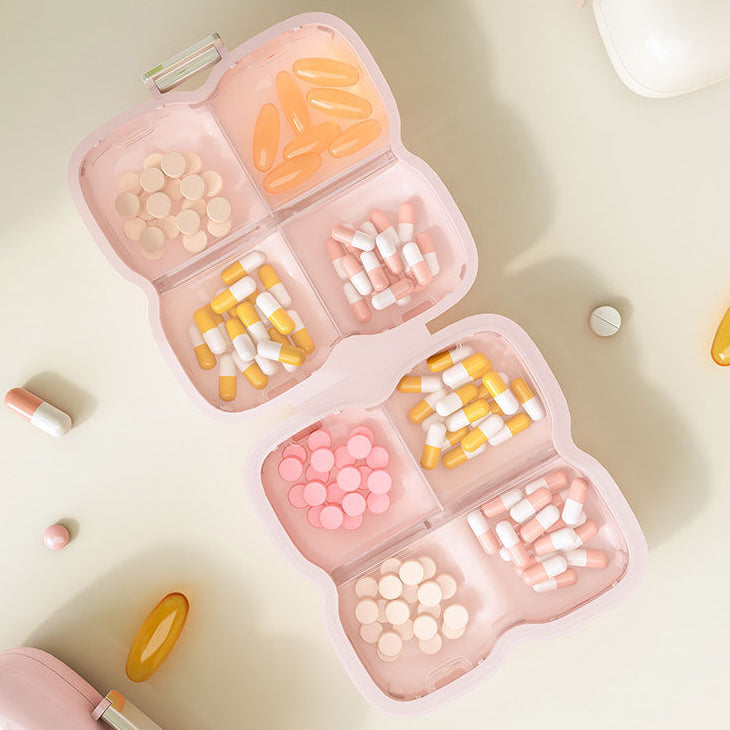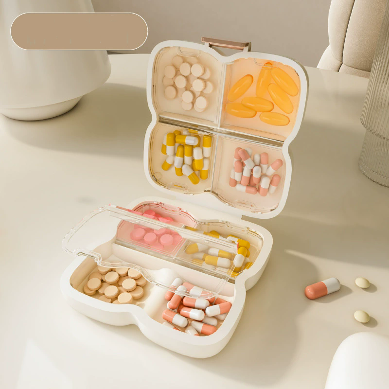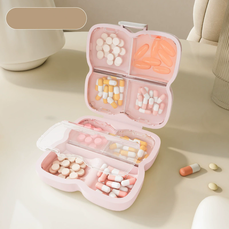 Cuenta con múltiples compartimentos internos que permiten separar distintos tipos de pastillas, cápsulas o suplementos, y gracias a su diseño también puede utilizarse como joyero para anillos, aretes u objetos pequeños. Es una solución linda, funcional y pensada para el uso diario.