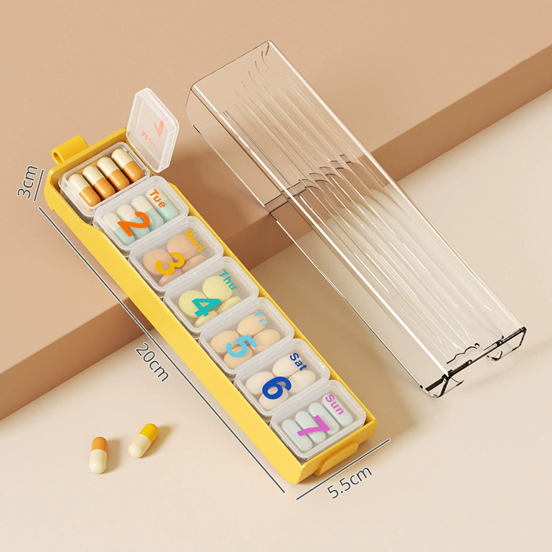 Mantén tus medicamentos, vitaminas o suplementos organizados con este práctico pastillero semanal portátil. Cuenta con 7 compartimentos individuales, uno para cada día de la semana, con tapa transparente y números/colores que facilitan la identificación. Su diseño compacto y moderno te permite llevarlo en la cartera, mochila o maleta sin ocupar espacio.