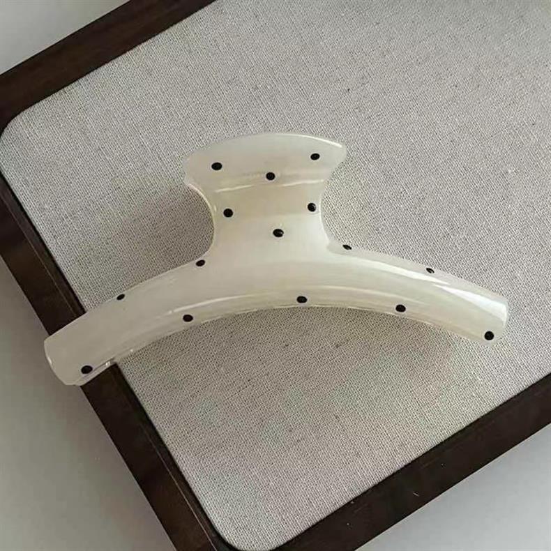 La pinza para cabello grande con lunares es un accesorio práctico y elegante ideal para recoger el cabello de forma rápida y segura. Su diseño curvo tipo claw clip permite sujetar el cabello cómodamente, creando moños bajos, recogidos casuales o estilos semi recogidos con acabado limpio y sofisticado.