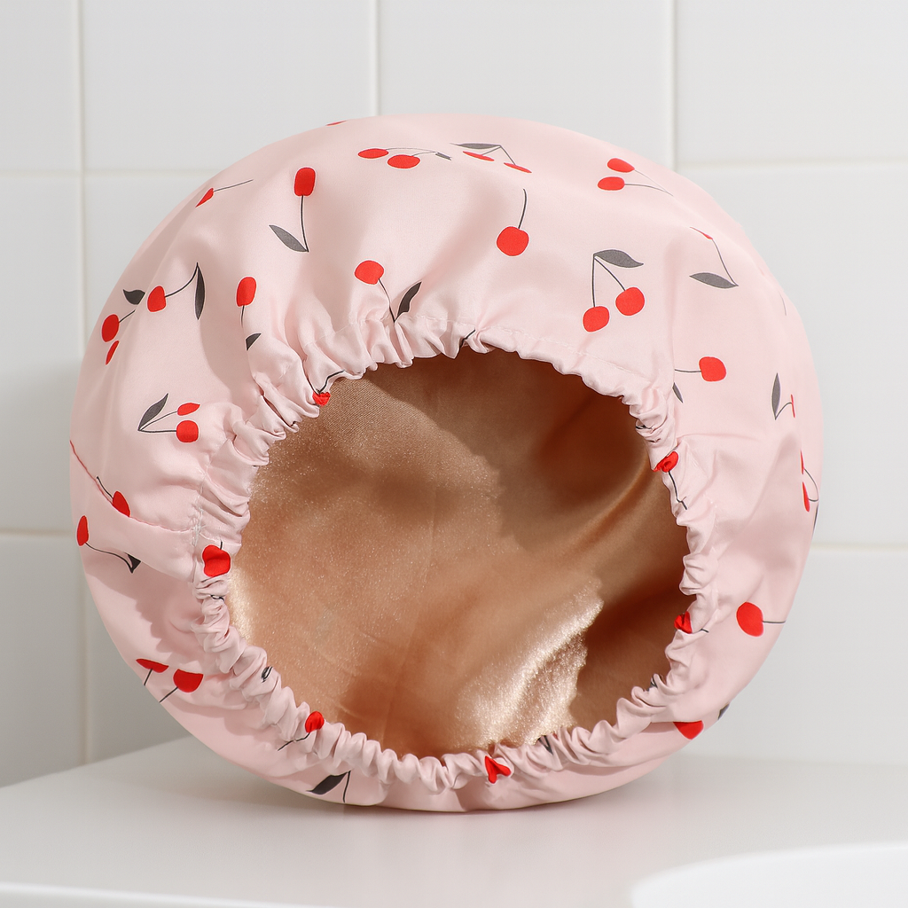Haz que tu rutina de baño sea más cute y funcional con nuestro gorro de baño con estampado de cerezas.