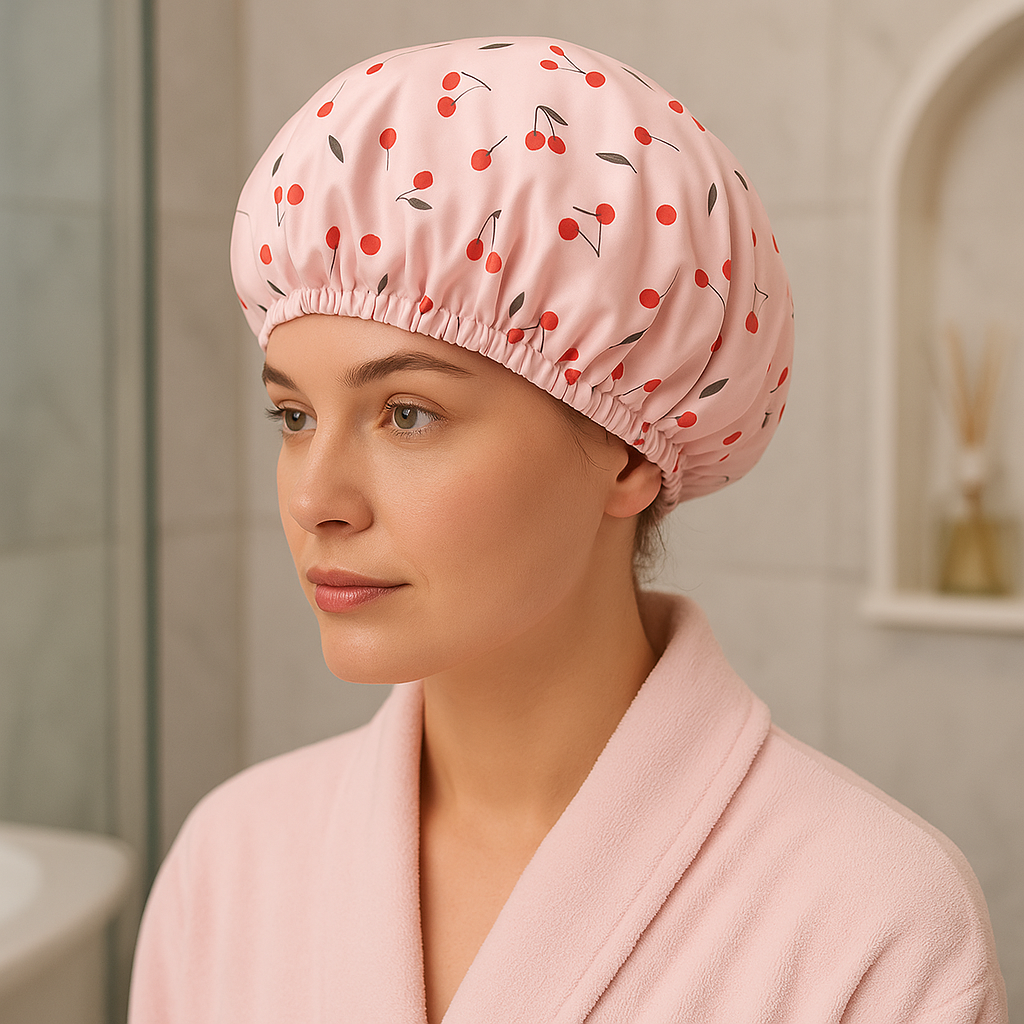 Diseñado para mantener tu cabello seco y protegido del agua, combina practicidad con un estilo adorable. Su interior suave y su banda elástica aseguran un ajuste cómodo y seguro, sin marcas ni tirones.