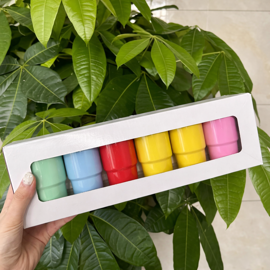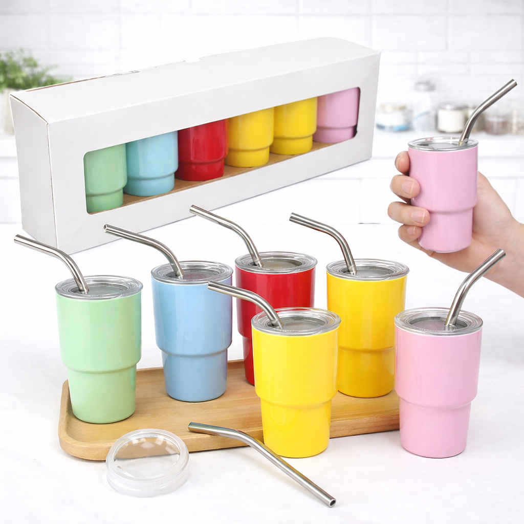 Este set de 6 mini termos térmicos es perfecto para quienes aman los detalles funcionales y llenos de color. Cada termo tiene un diseño compacto, moderno y aesthetic, ideal para disfrutar café, té, matcha, jugos o bebidas frías en porciones pequeñas. Incluyen tapa y pajilla metálico reutilizable, lo que los hace prácticos, cómodos y perfectos para el día a día.