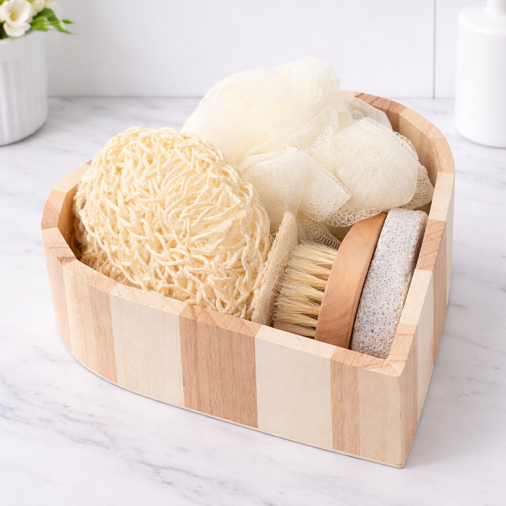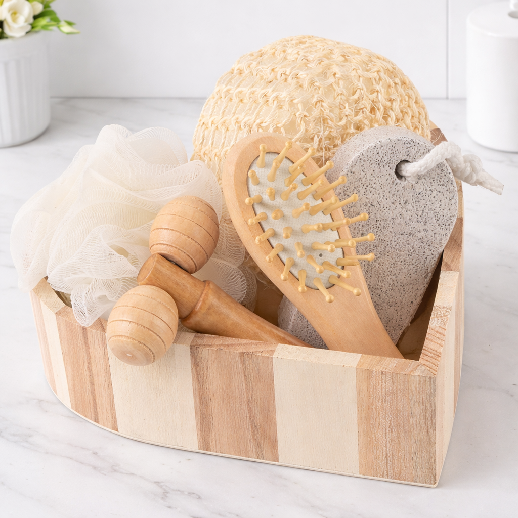 Este set spa de baño incluye varios accesorios diseñados para mejorar la rutina de cuidado corporal y convertir el momento de la ducha en una experiencia relajante. Presentado en una elegante caja de madera con forma de corazón, el conjunto combina herramientas de limpieza y exfoliación que ayudan a mantener la piel suave y revitalizada.