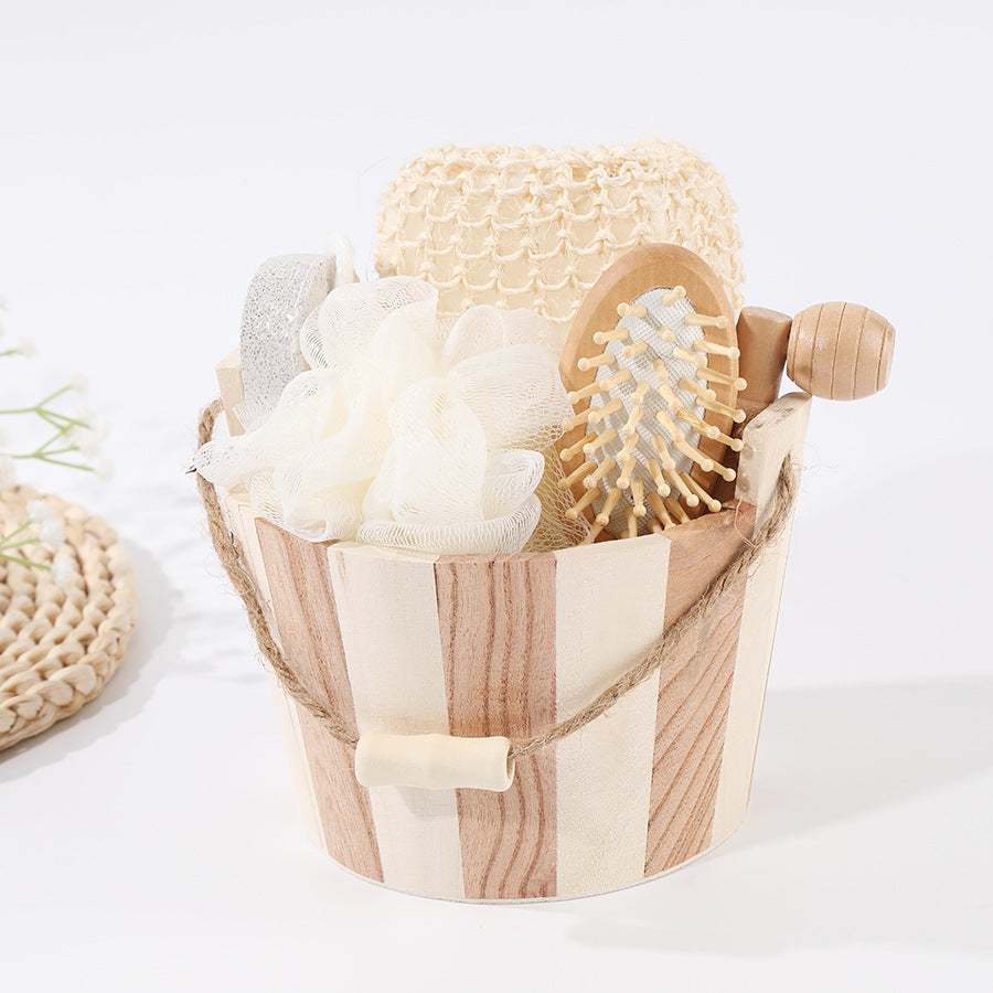 Este set spa de baño reúne varios accesorios diseñados para mejorar la rutina de cuidado corporal y transformar la ducha en una experiencia relajante. Incluye una cubeta decorativa de madera que funciona tanto como contenedor del set como organizador para accesorios de baño. Su diseño natural aporta un estilo cálido y elegante al espacio del baño.