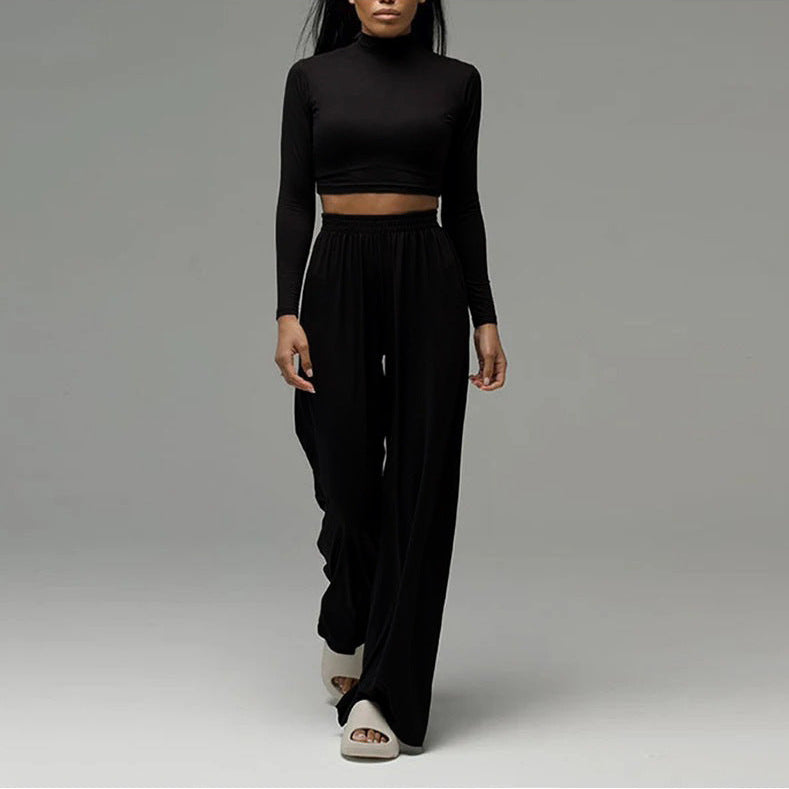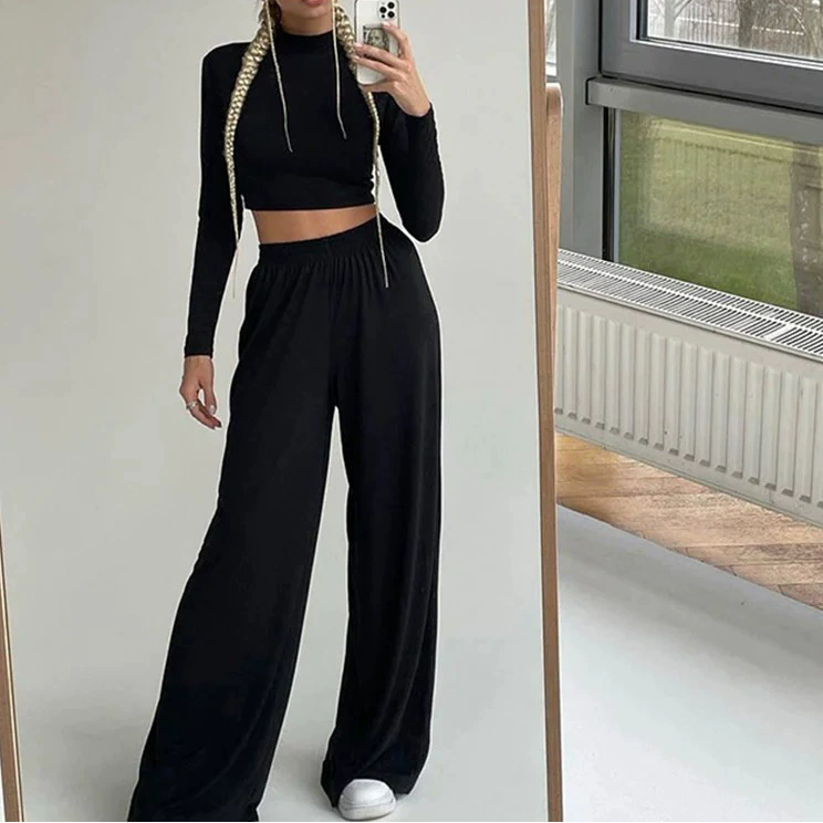 Moderno y versátil, este conjunto  incluye un crop top de manga larga con cuello alto y pantalones amplios de cintura elástica. Perfecto para un look minimalista y elegante, ideal para combinar con zapatillas o sandalias para un estilo casual y cómodo.